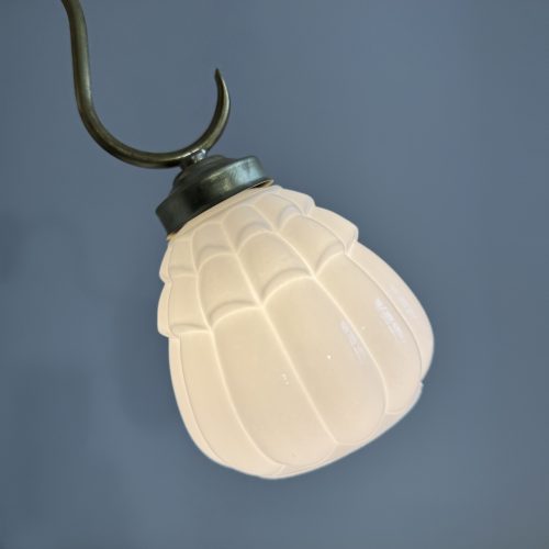 Trio d’appliques vintage en céramique et leur abat-jour en opaline parsemé de motifs dorés. En bel état général. Quelques traces du temps.