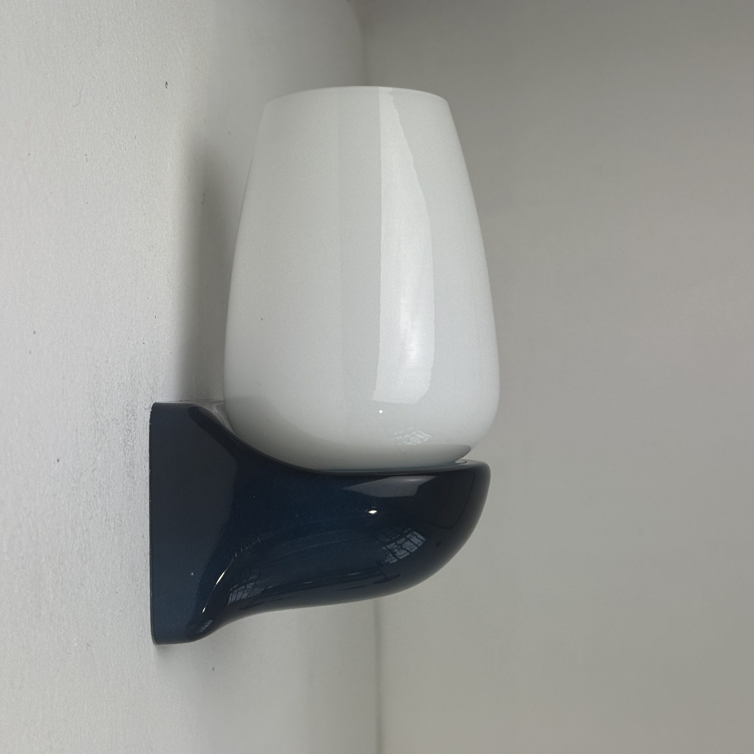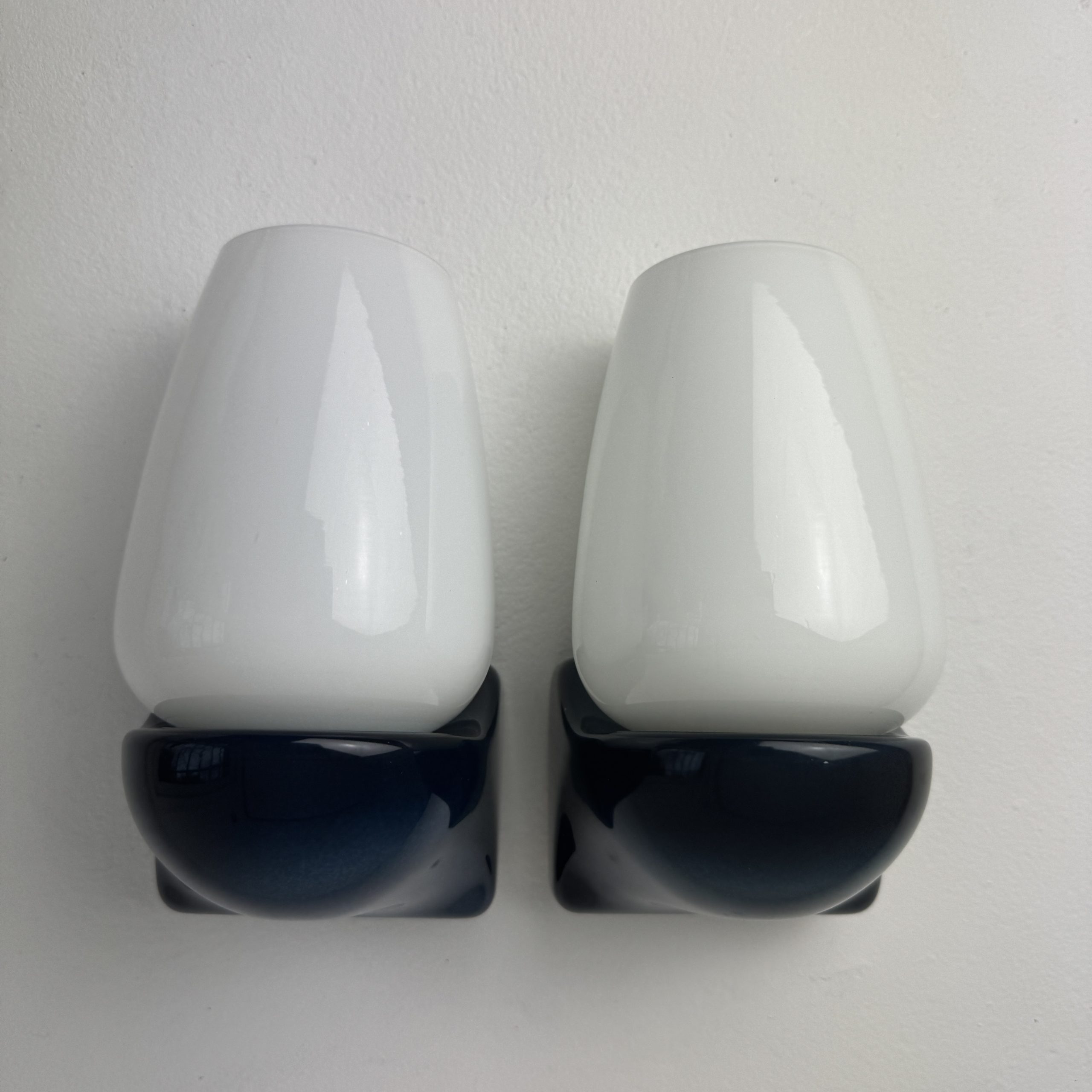 Lot de 2 appliques des années 1970. La base bleue est en plastique, les abat-jours en opaline. En bel état général. Et très beau bleu.