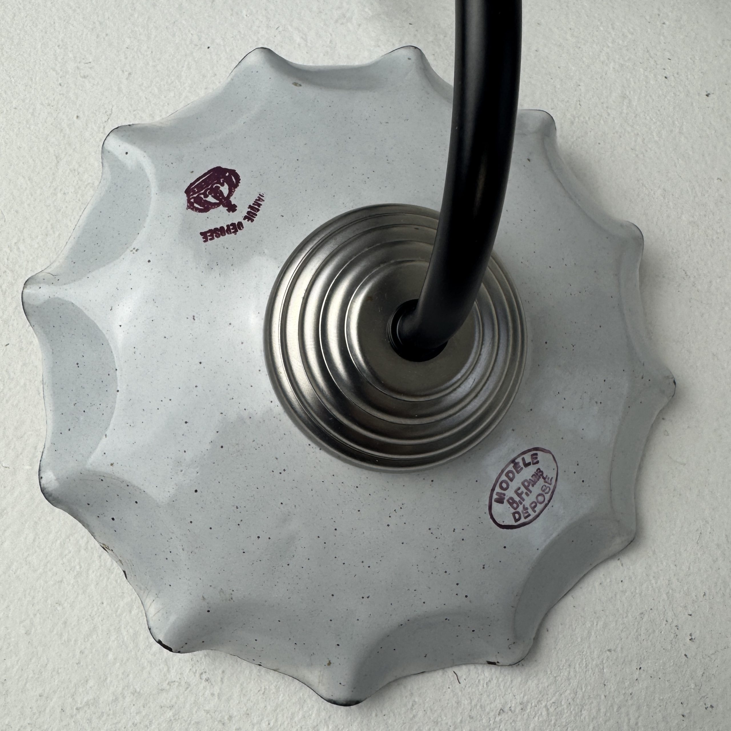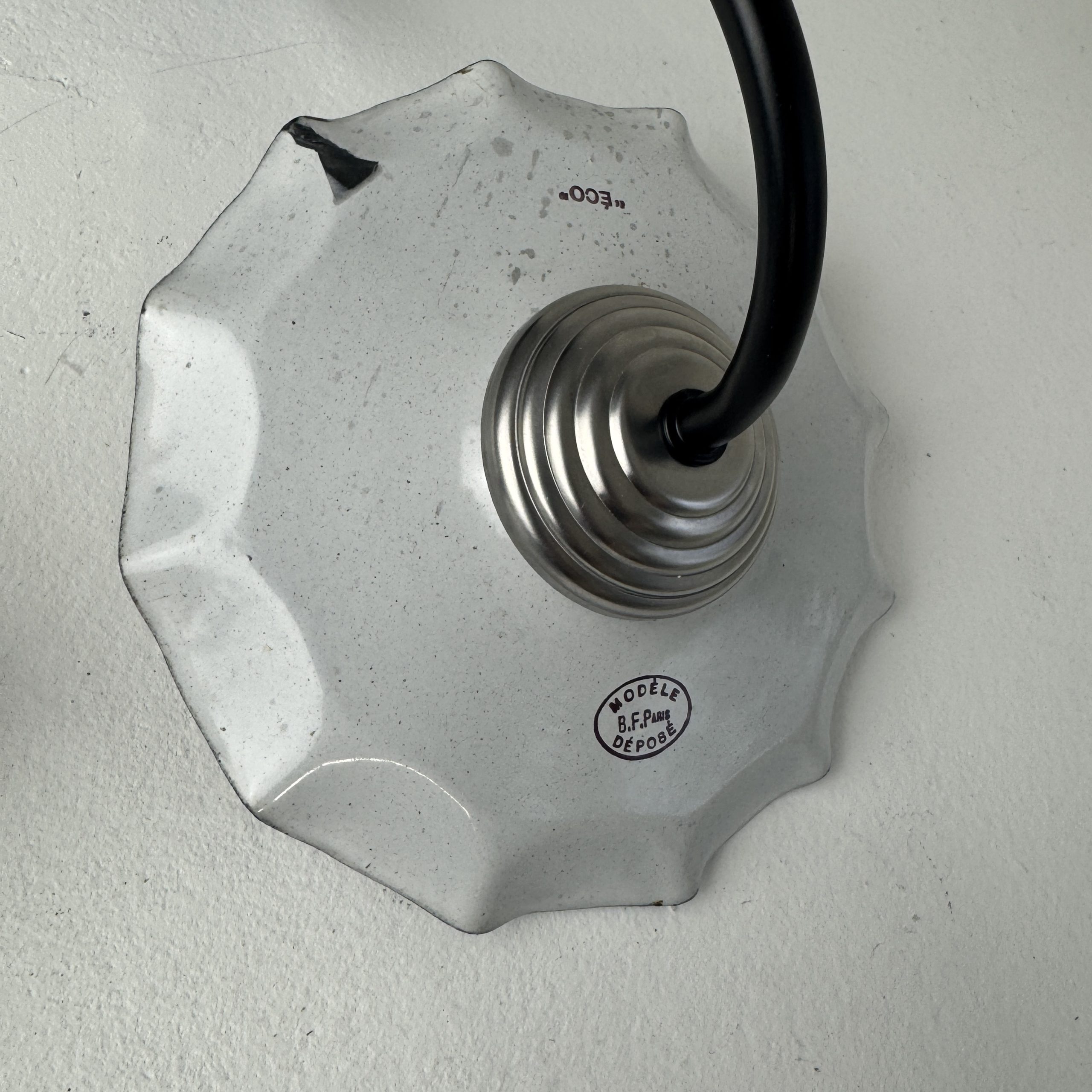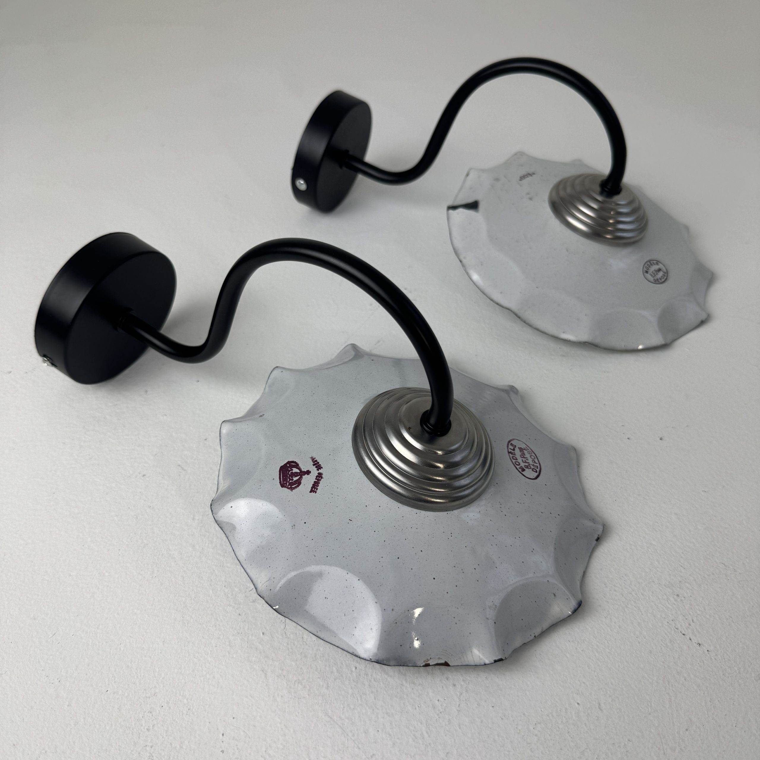 2 appliques col de cygne en métal avec leur abat-jour en tôle émaillée. Des sauts d’émail et points de rouille. La base et le bras sont neufs.