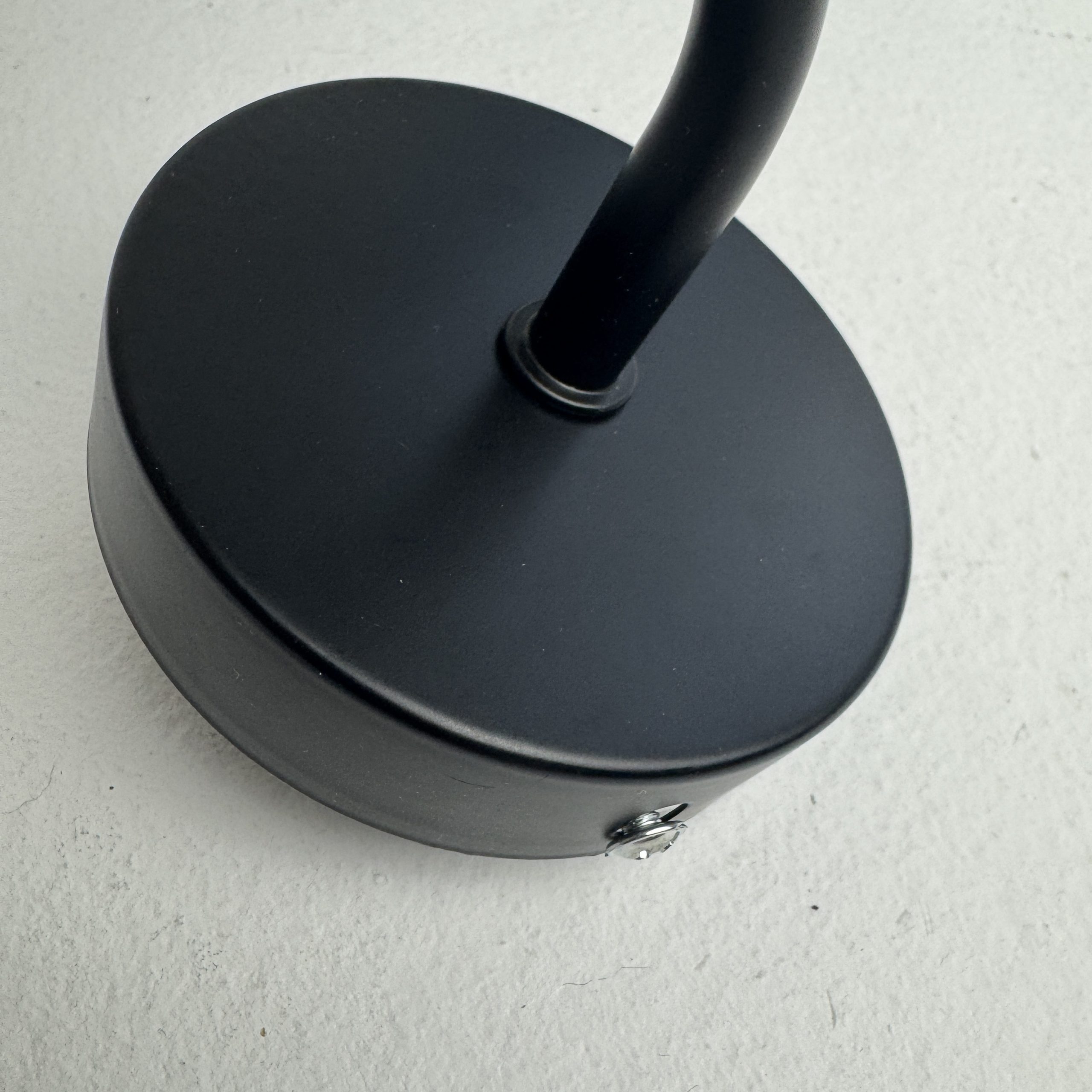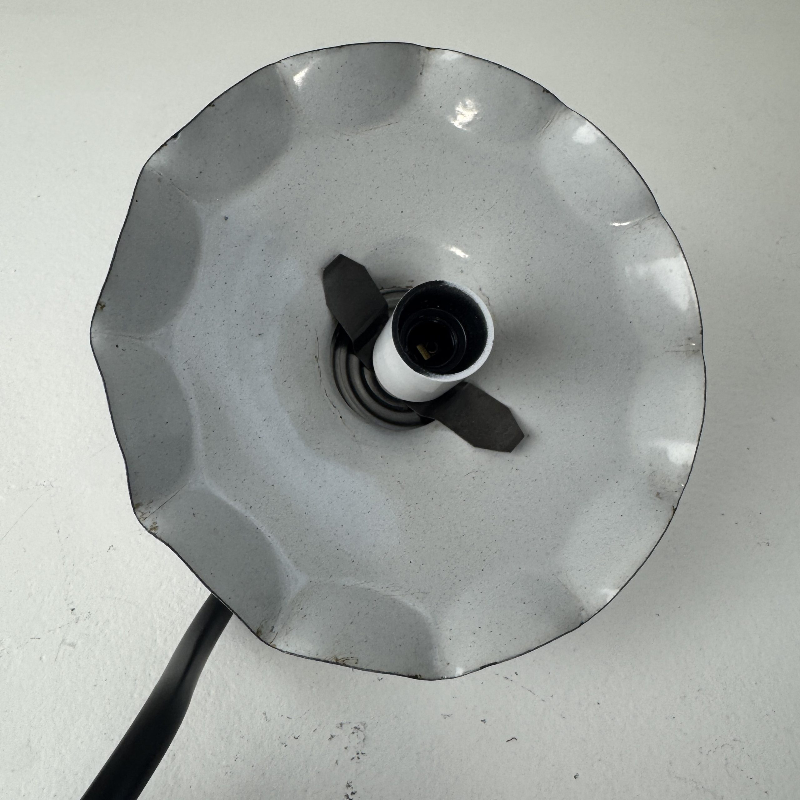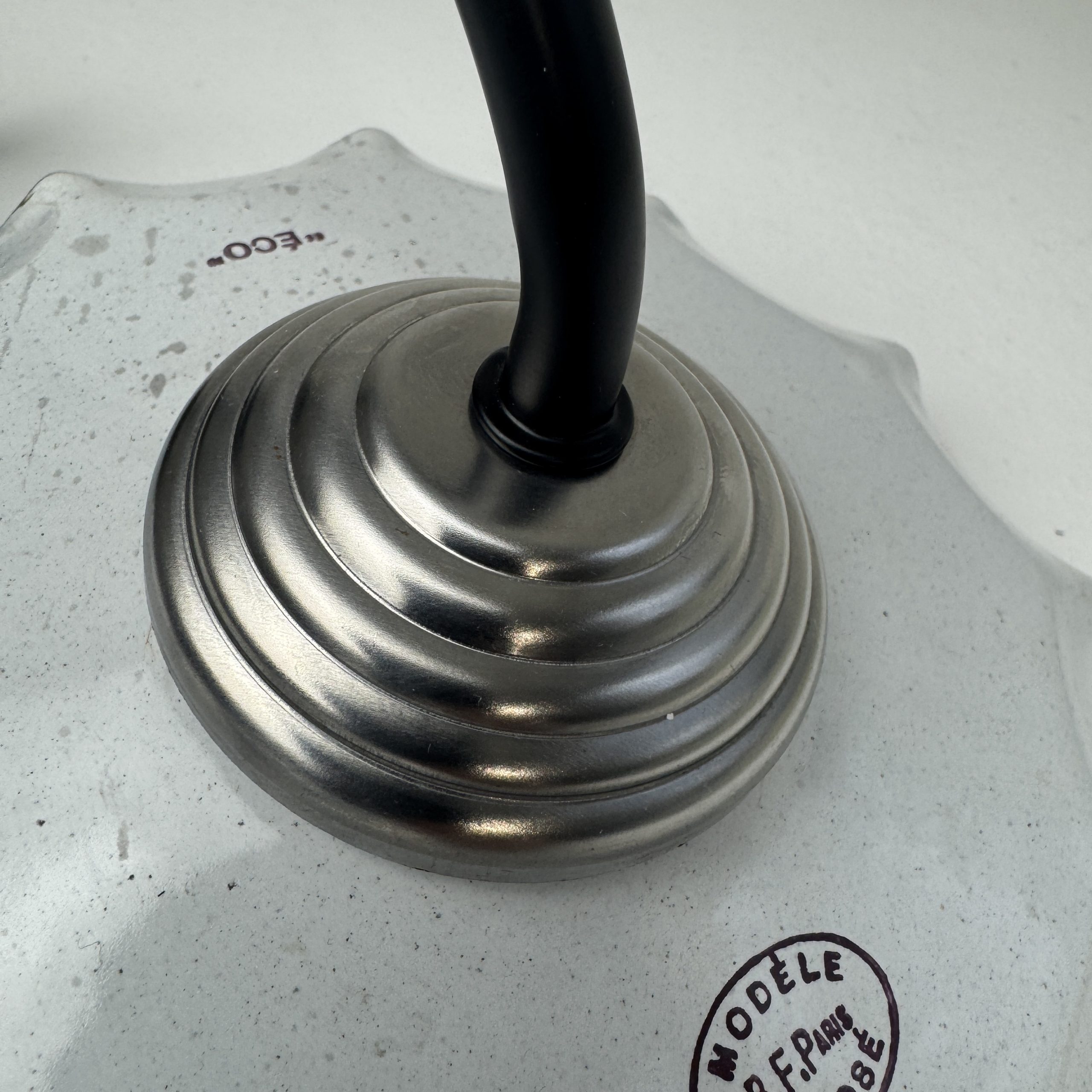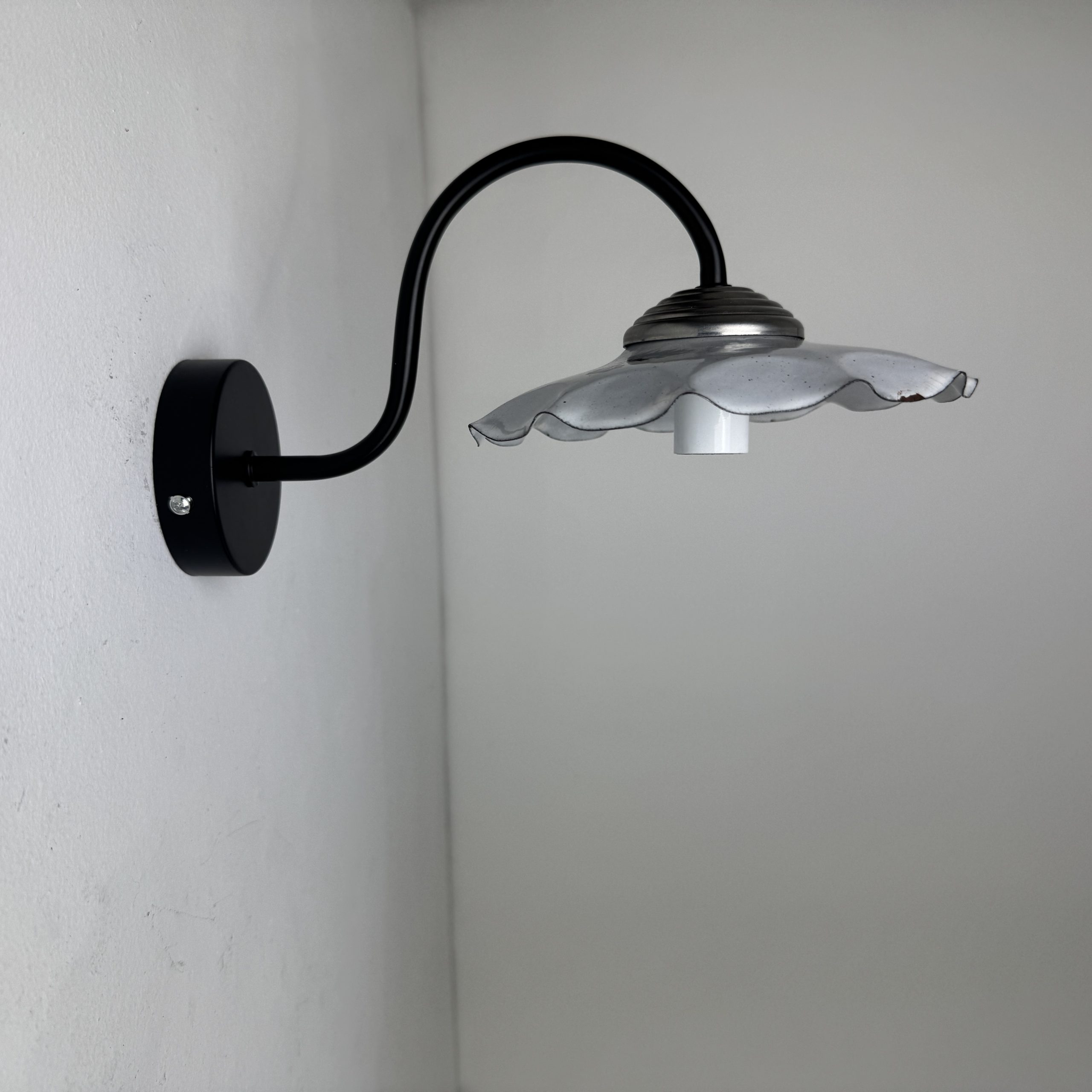 2 appliques col de cygne en métal avec leur abat-jour en tôle émaillée. Des sauts d’émail et points de rouille. La base et le bras sont neufs.