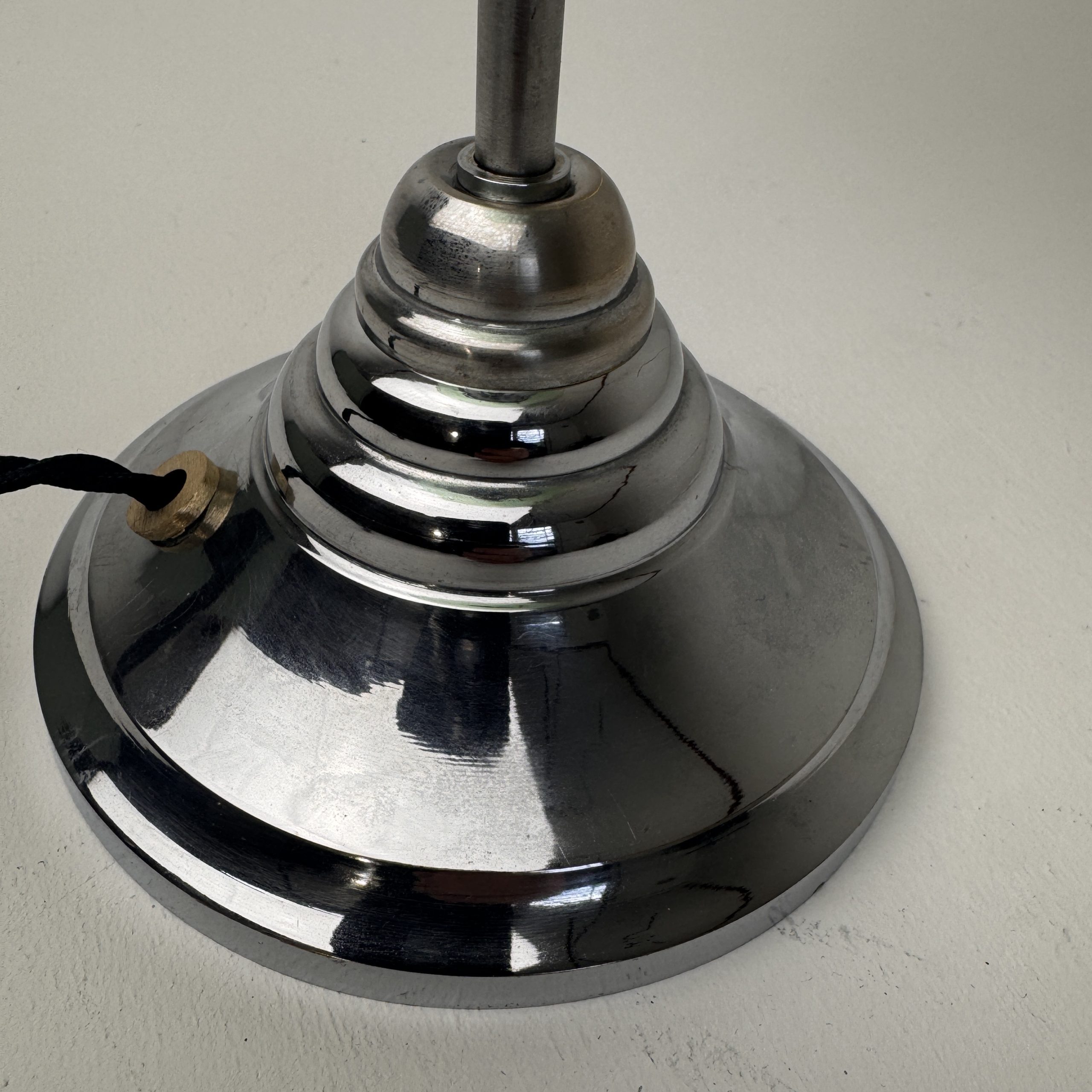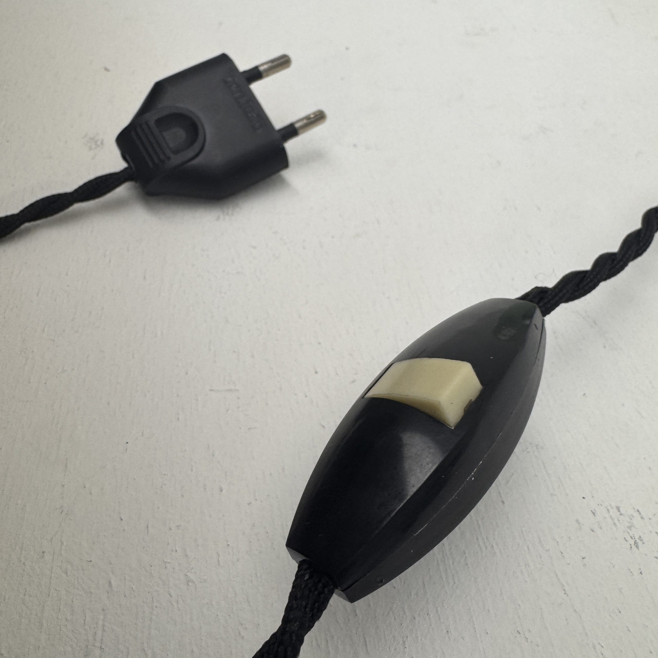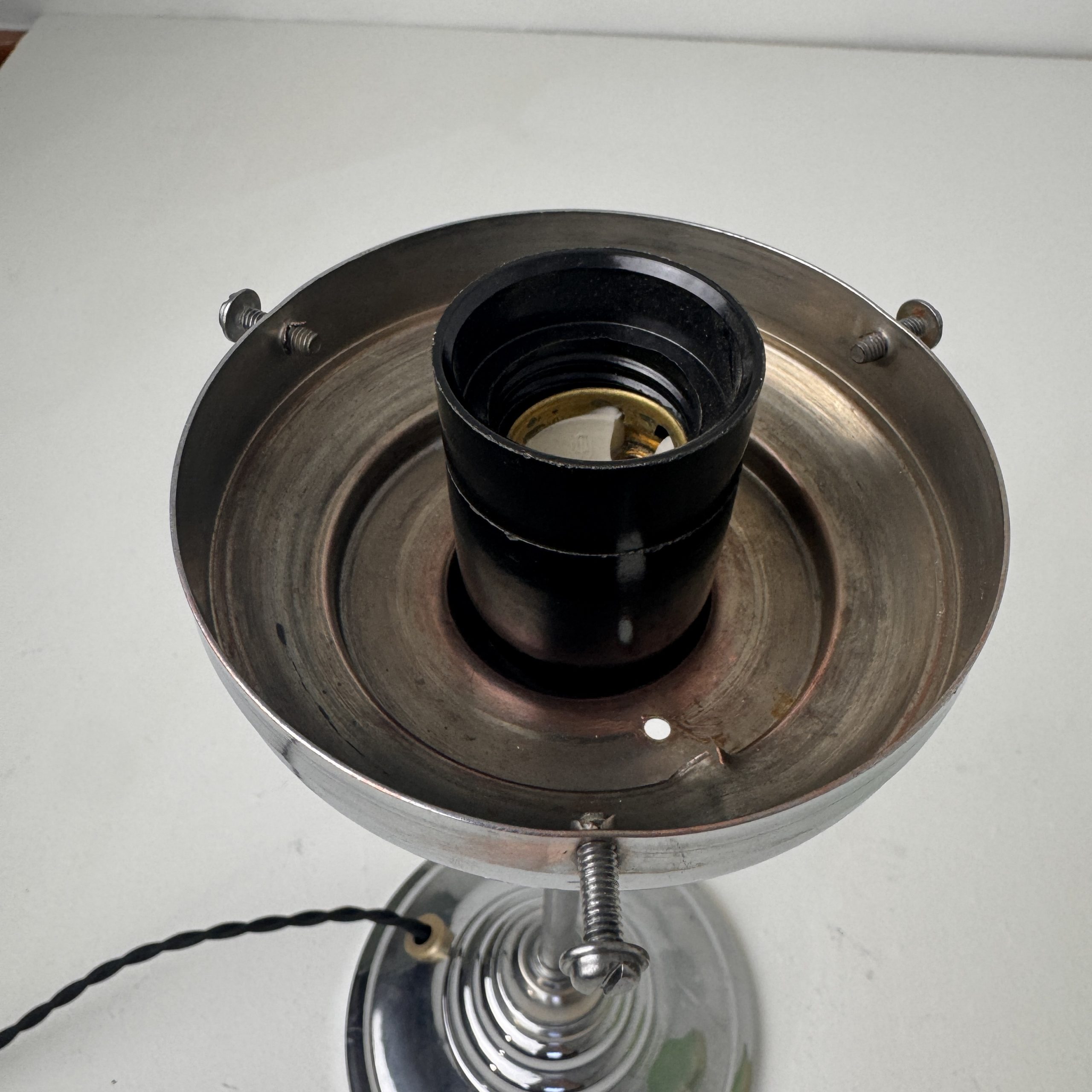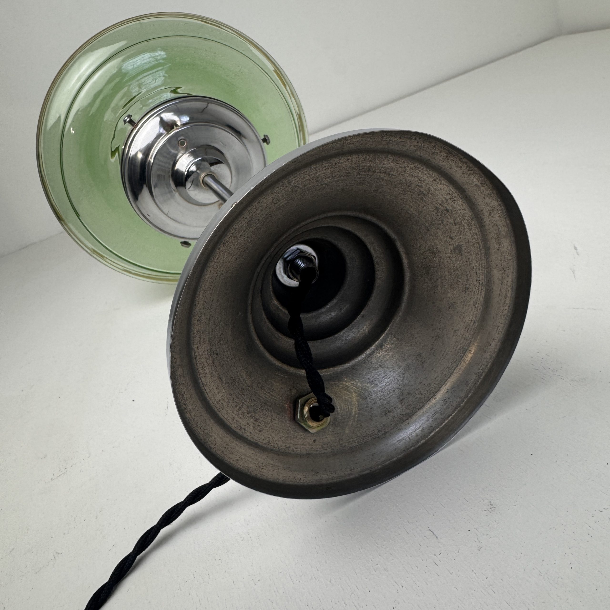 Démontée, nettoyée et électricité refaite à neuf avec fil noir en tissu torsadé. Interrupteur sur fil. Douille à vis gros culot (ampoule E27). Idéale avec une ampoule Edison.