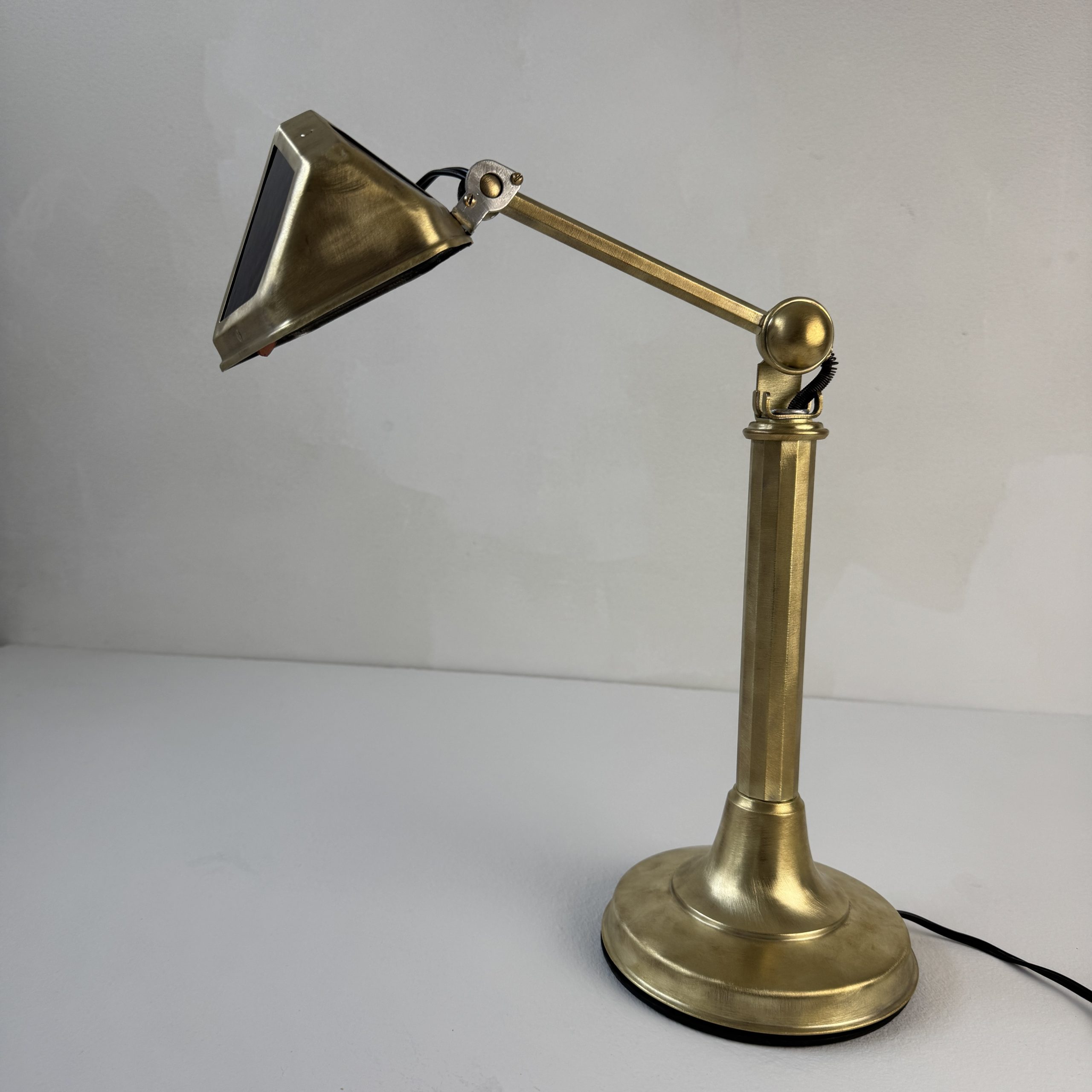 Base lestée. Cette lampe possède un bras rétractable qui peut s’articuler à l’horizontal.