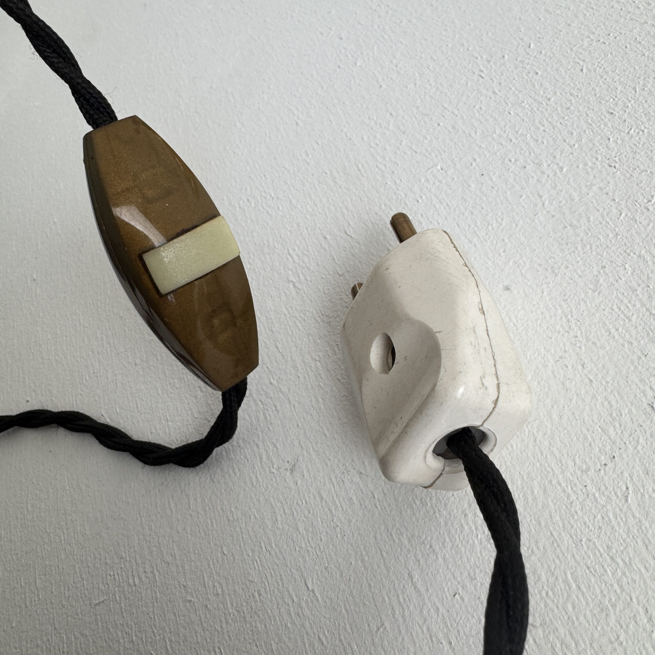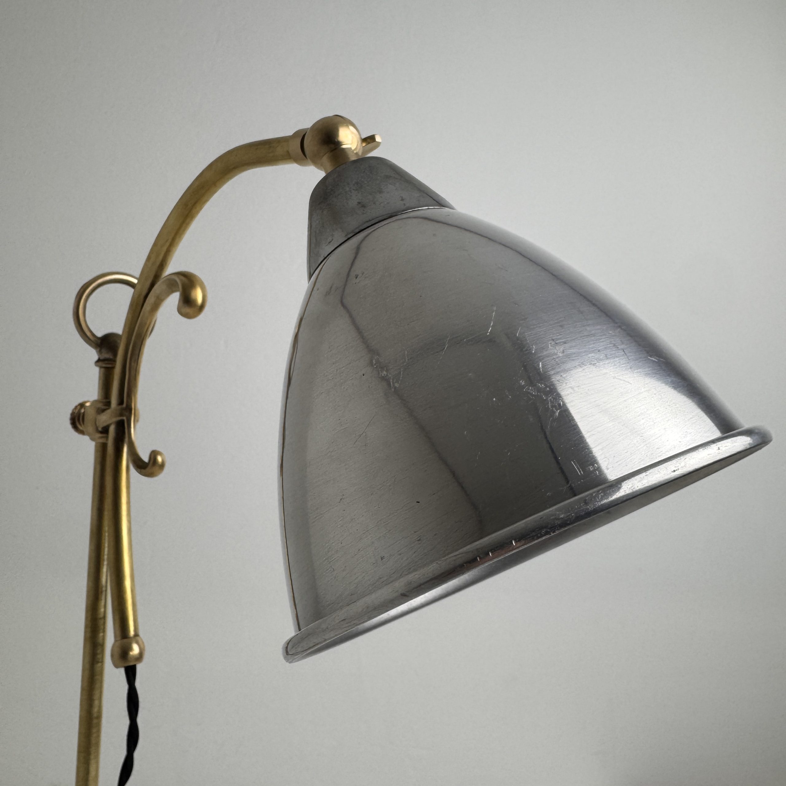 Cette lampe a été démontée et poncée. Electricité refaite à neuf avec fil noir en tissu tressé. Interrupteur sur fil et douille à vis petit culot (ampoule E14).