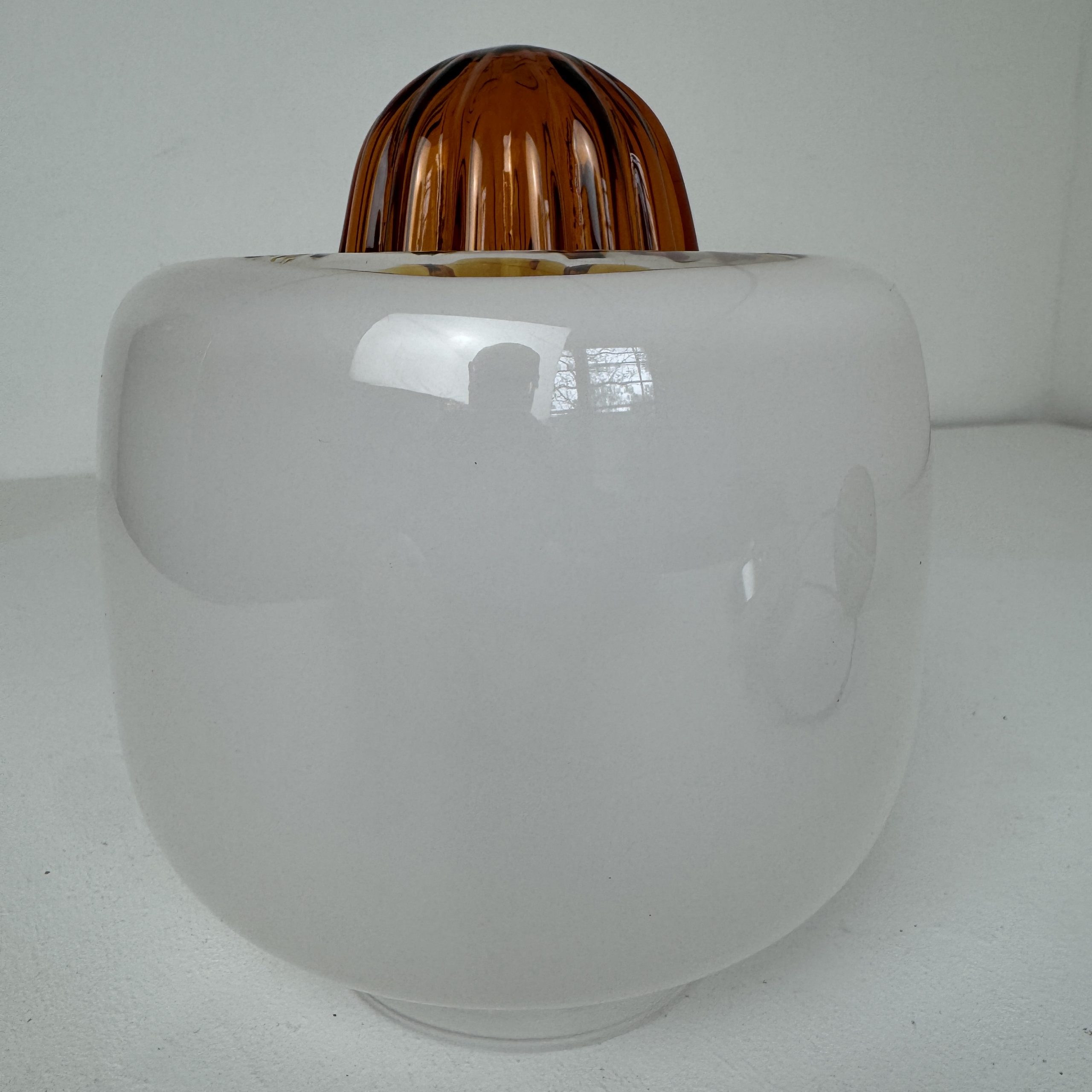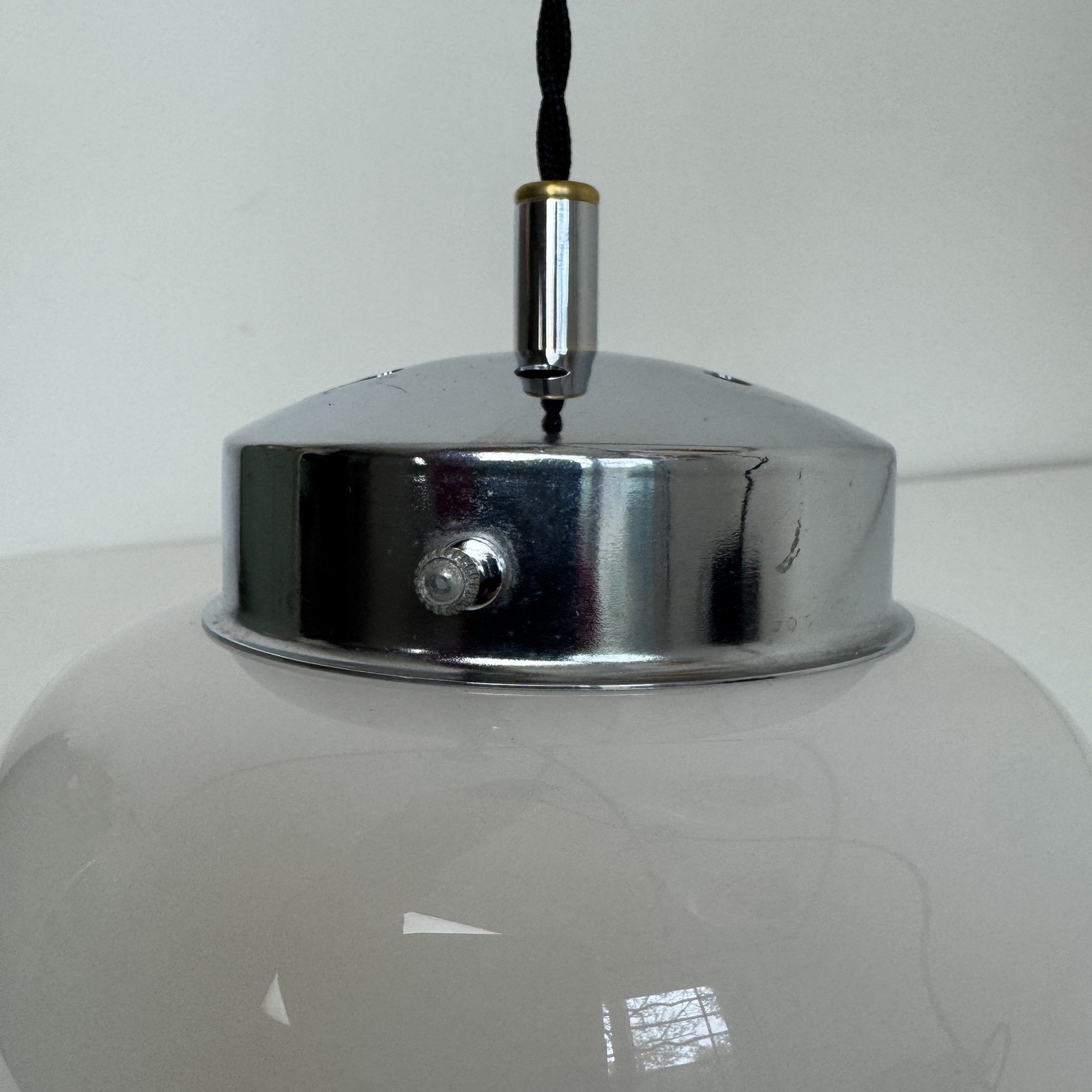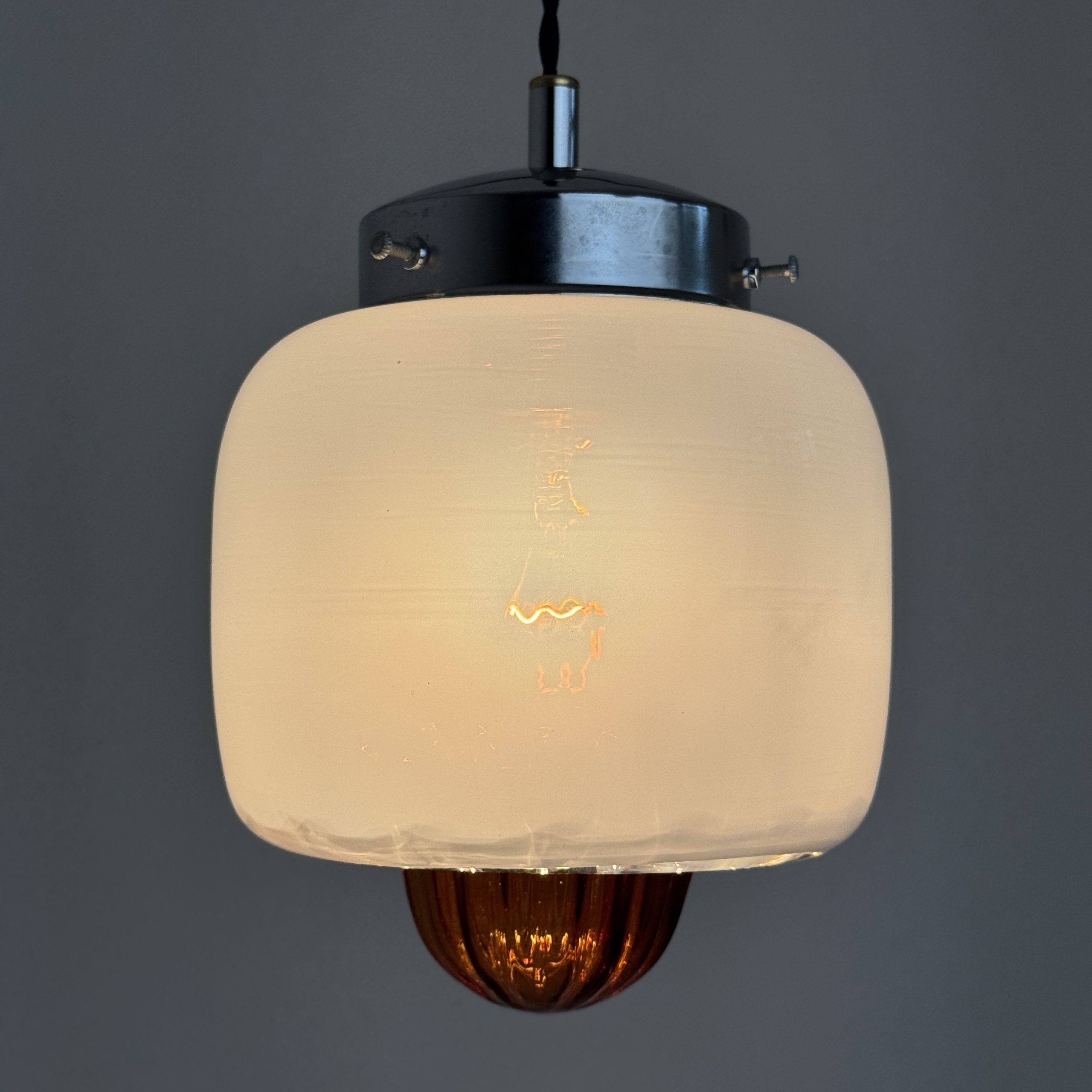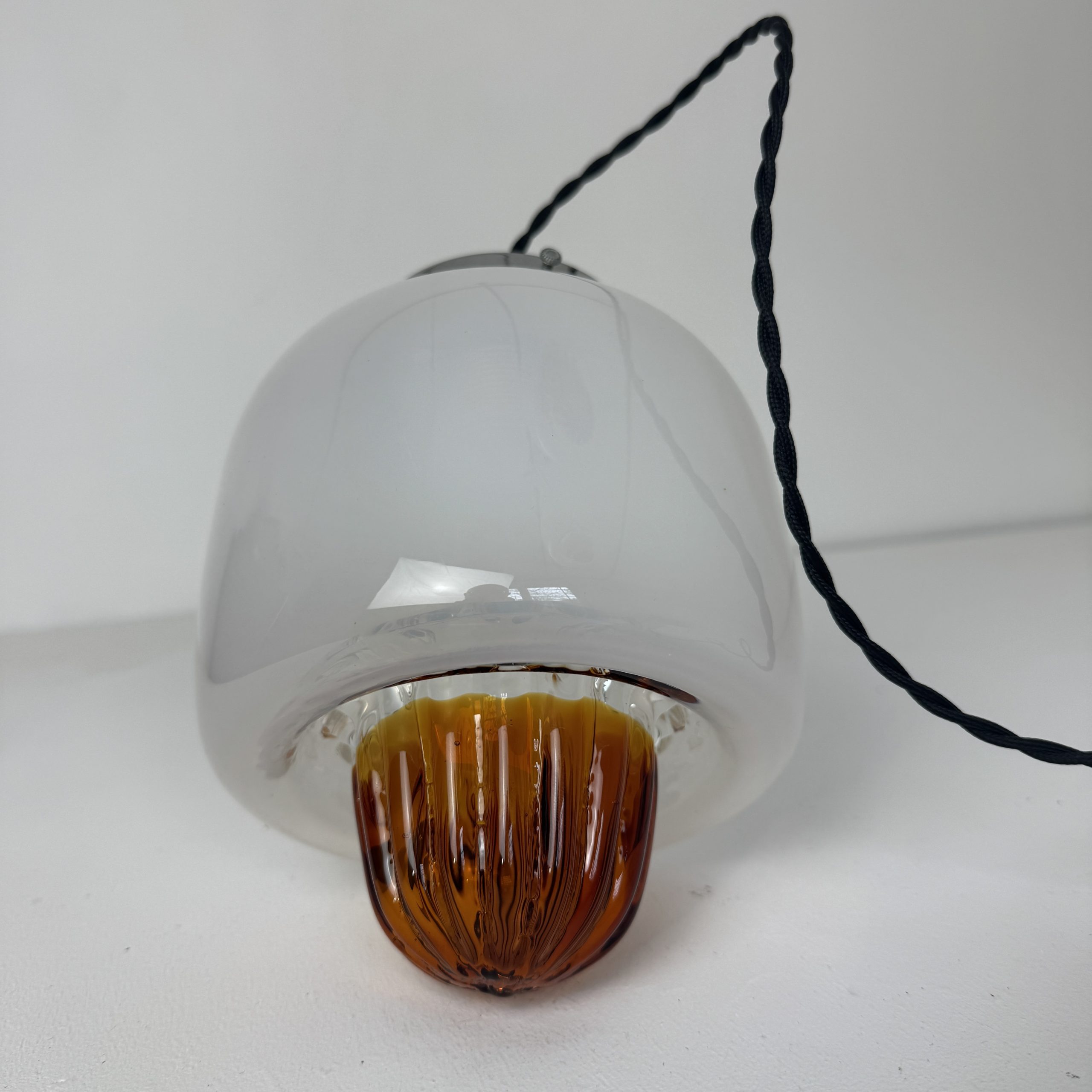 Verre opalescent sur la partie supérieure et transparent vers le bas avec moulure colorée pour un bel effet de lumière. Griffe en métal chromé.