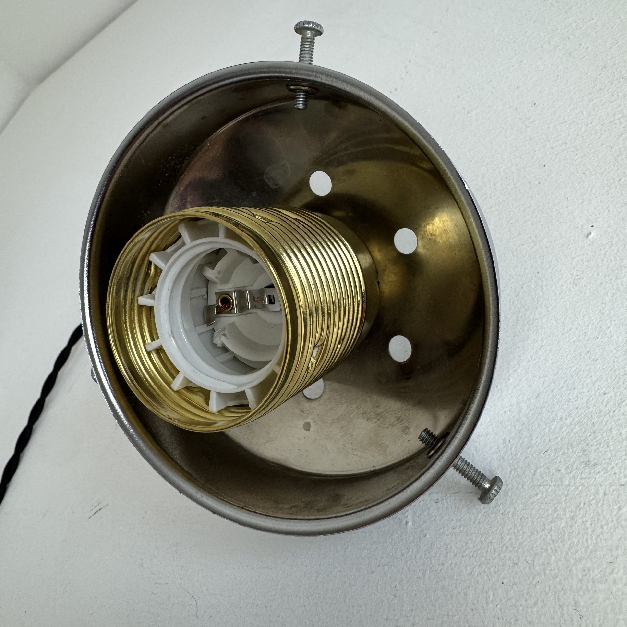 Branchement par domino. Fil noir en tissu tressé et rosace de fixation en métal doré.