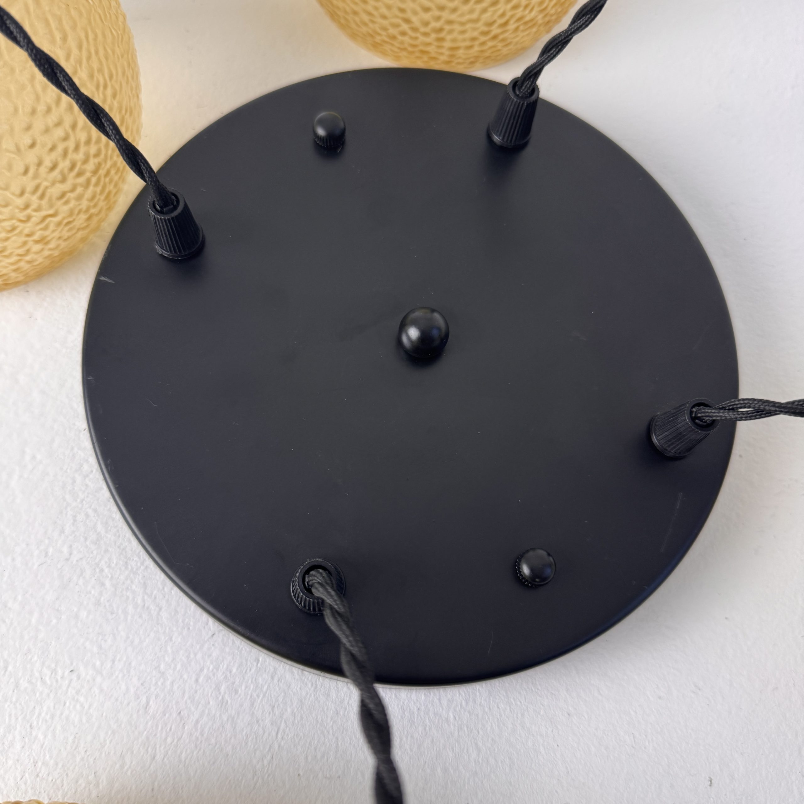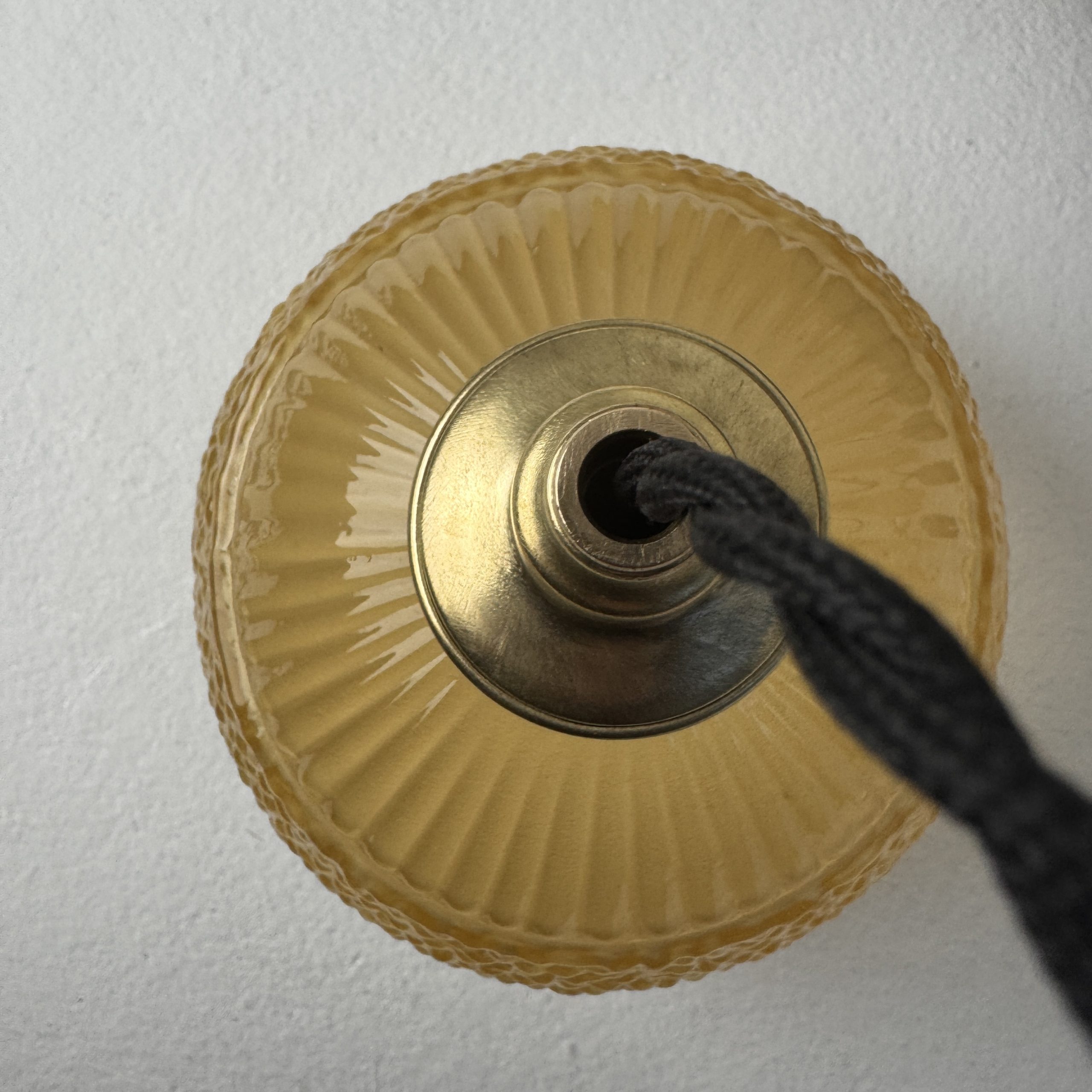 Lustre 4 feux en verre ambré et texturé des années 1960. En très bel état. Bel effet de lumière.