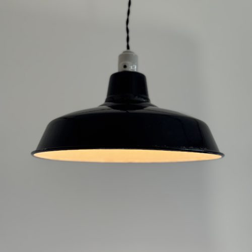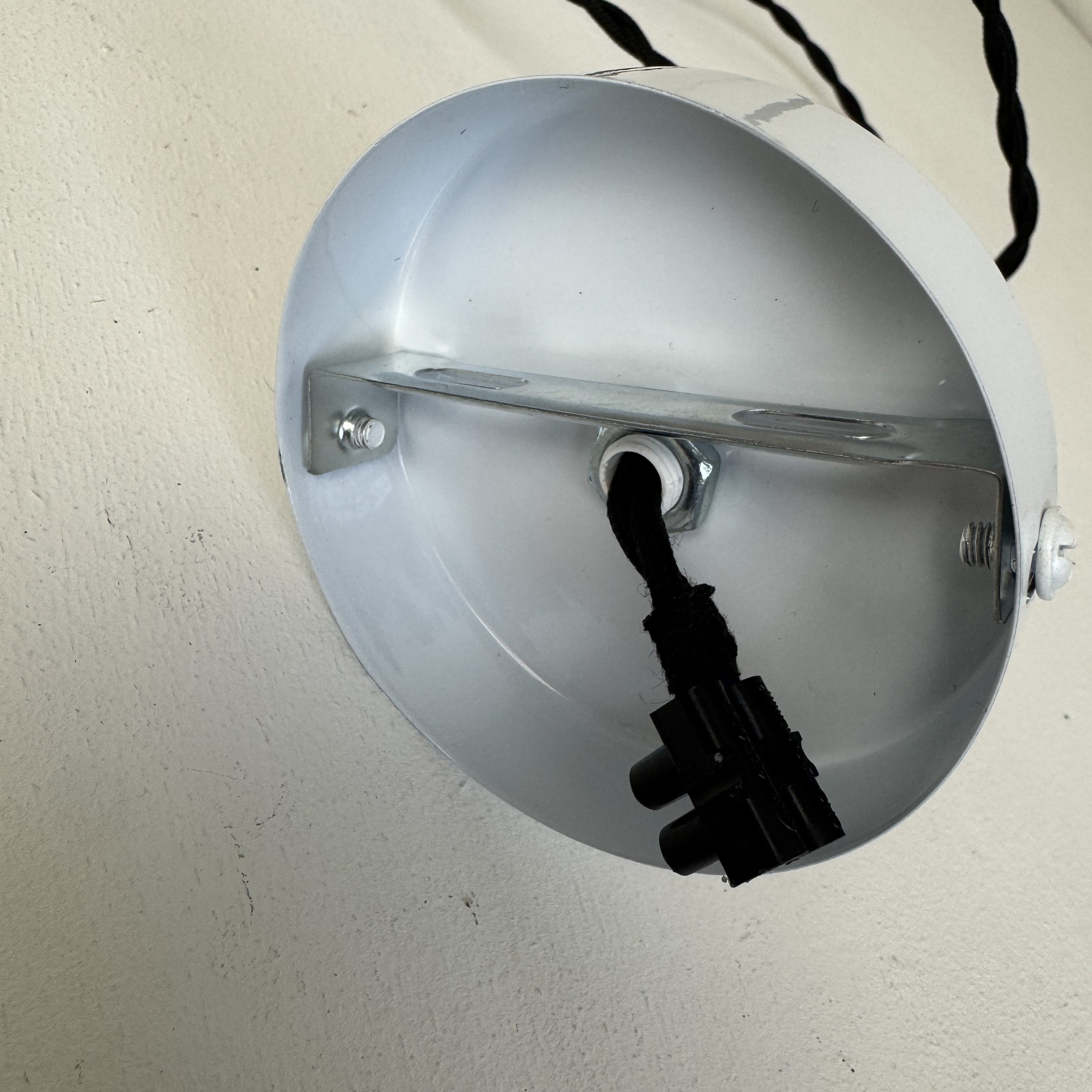 Branchement par domino. Fil noir en tissu tressé et rosace de fixation en métal blanc.