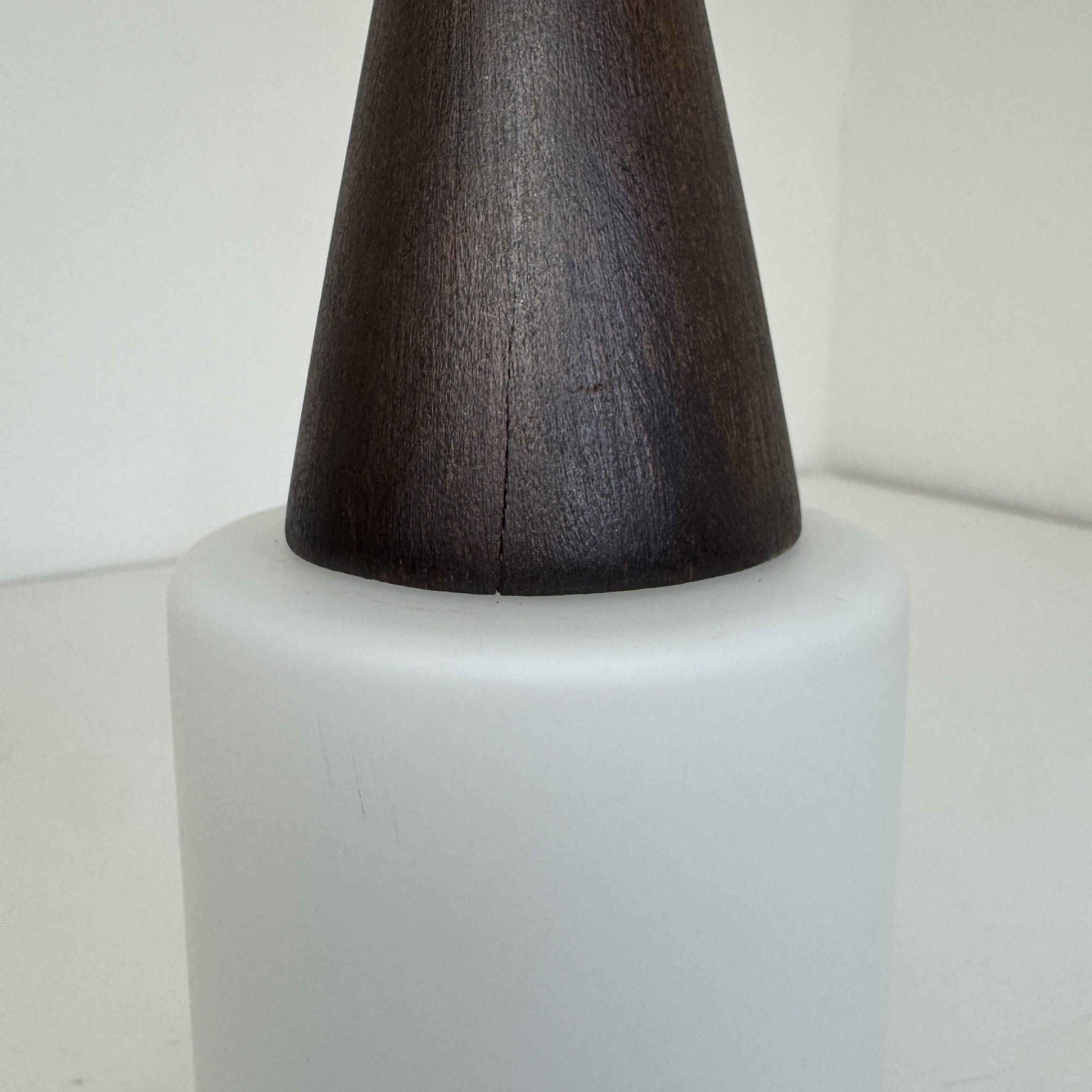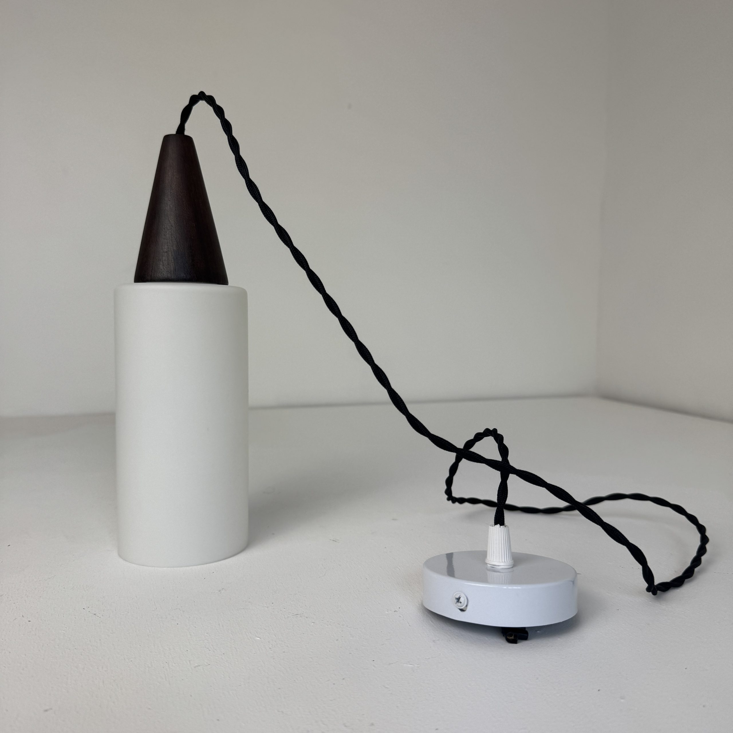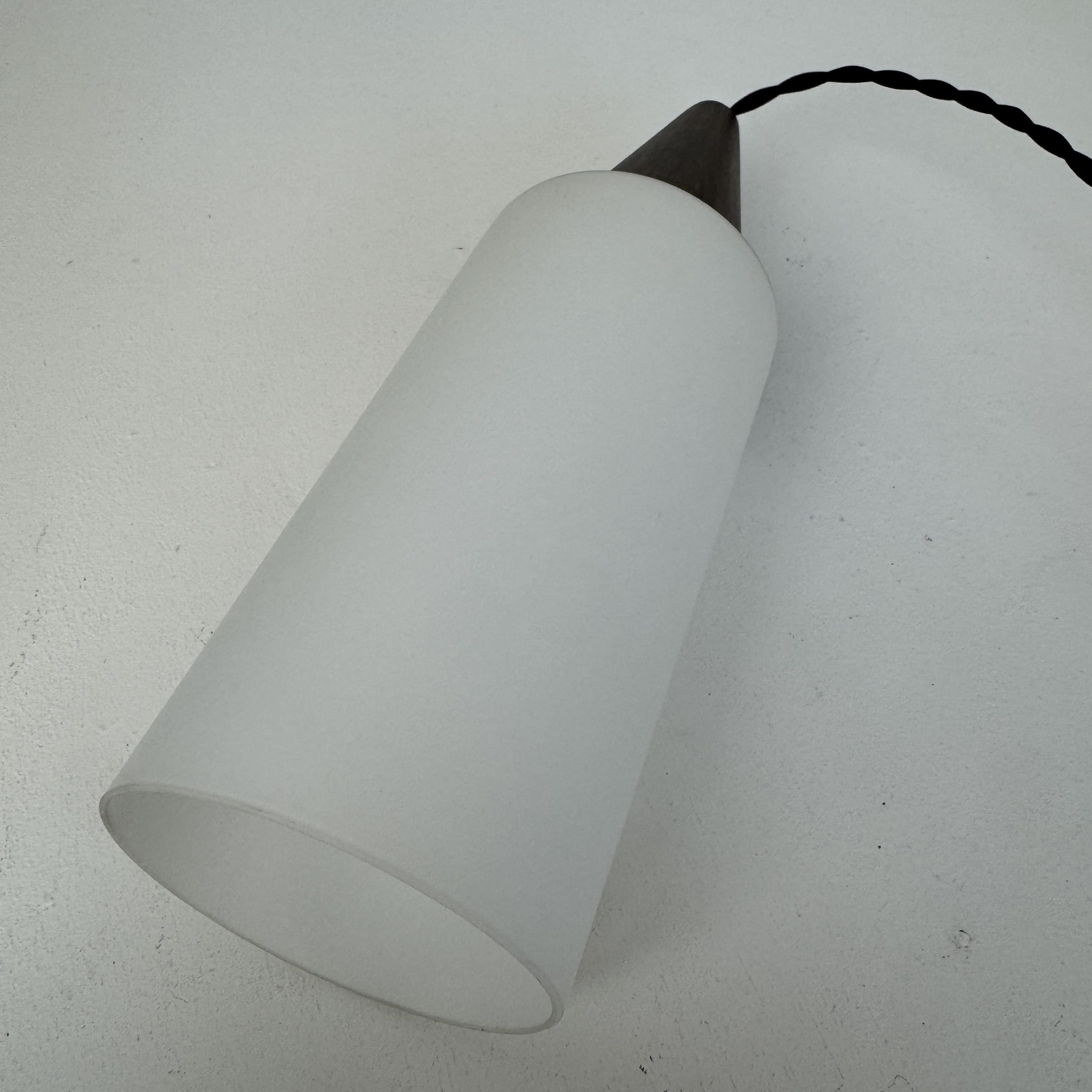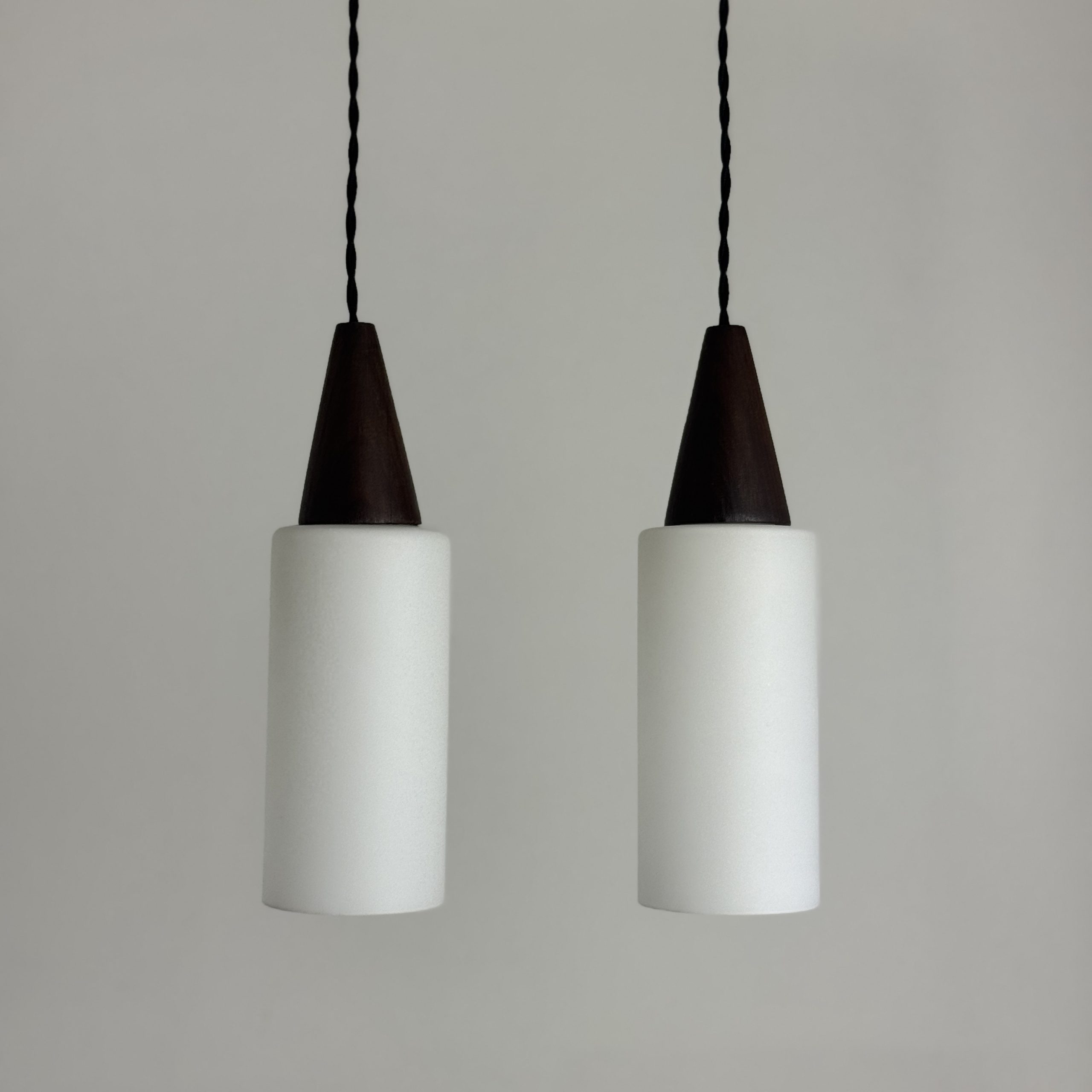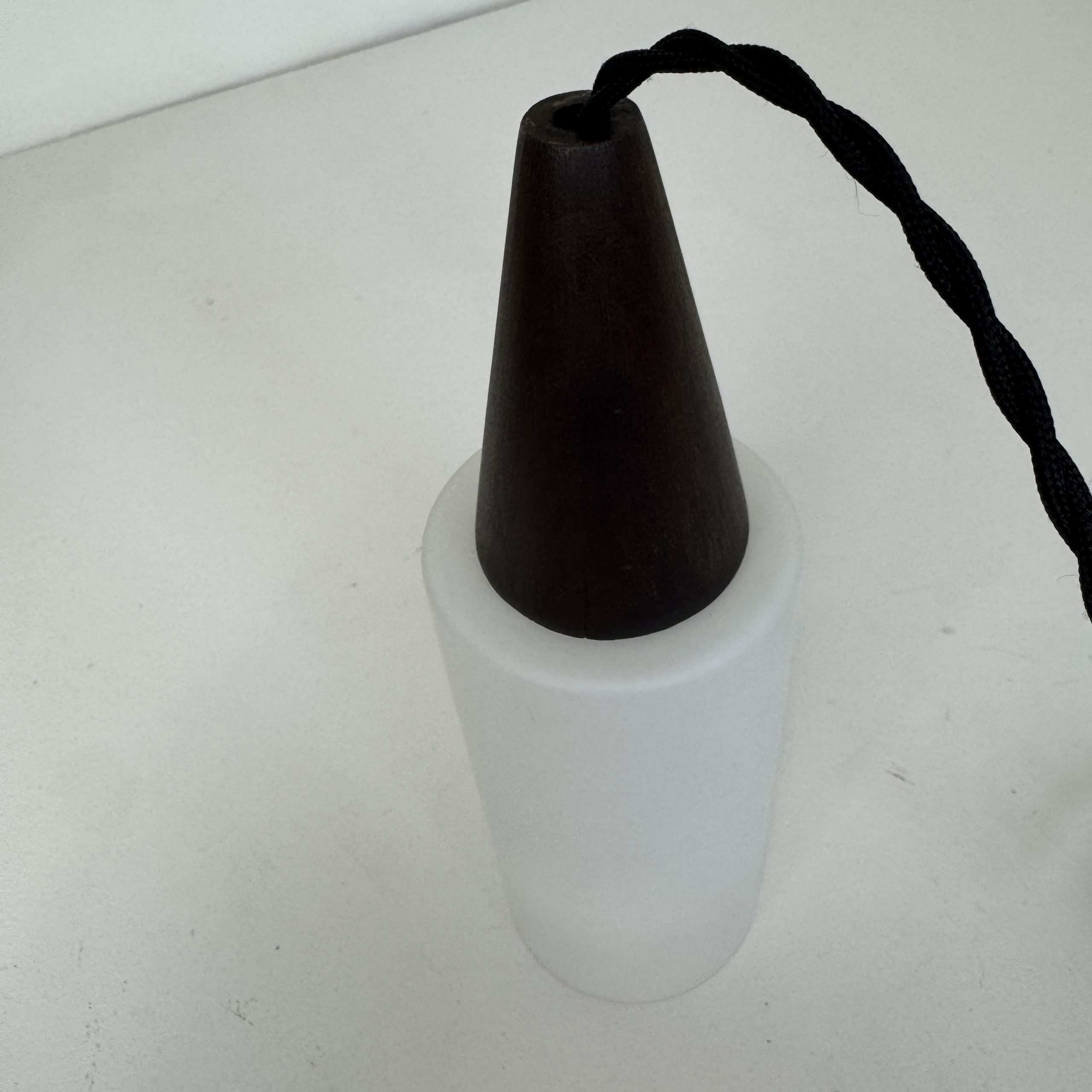 Lot de 2 belles suspensions scandinave en opaline et teck. Année 1970. En bel état général. A noter des traces du temps..
