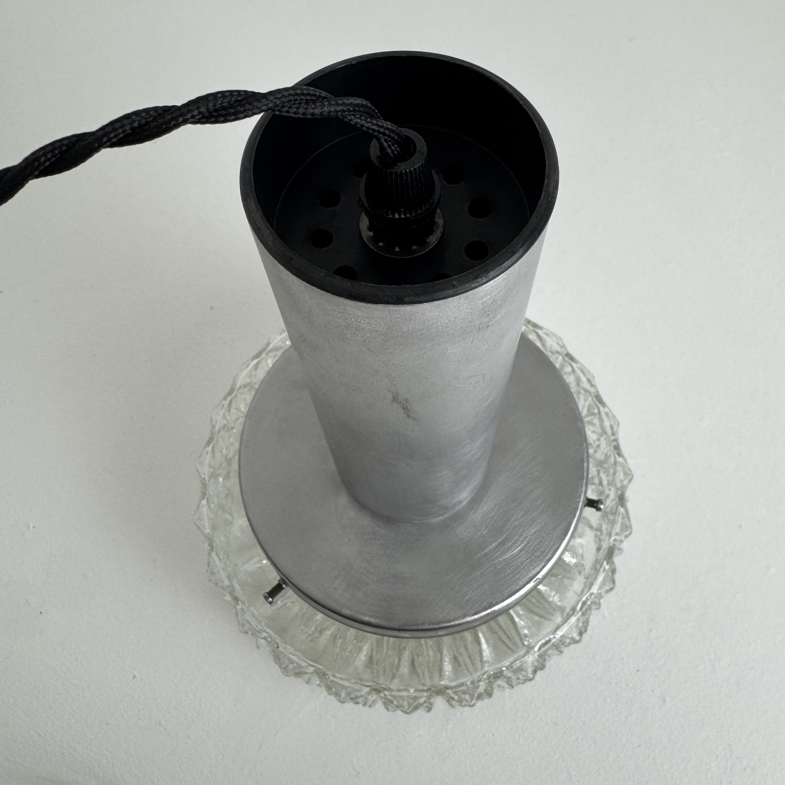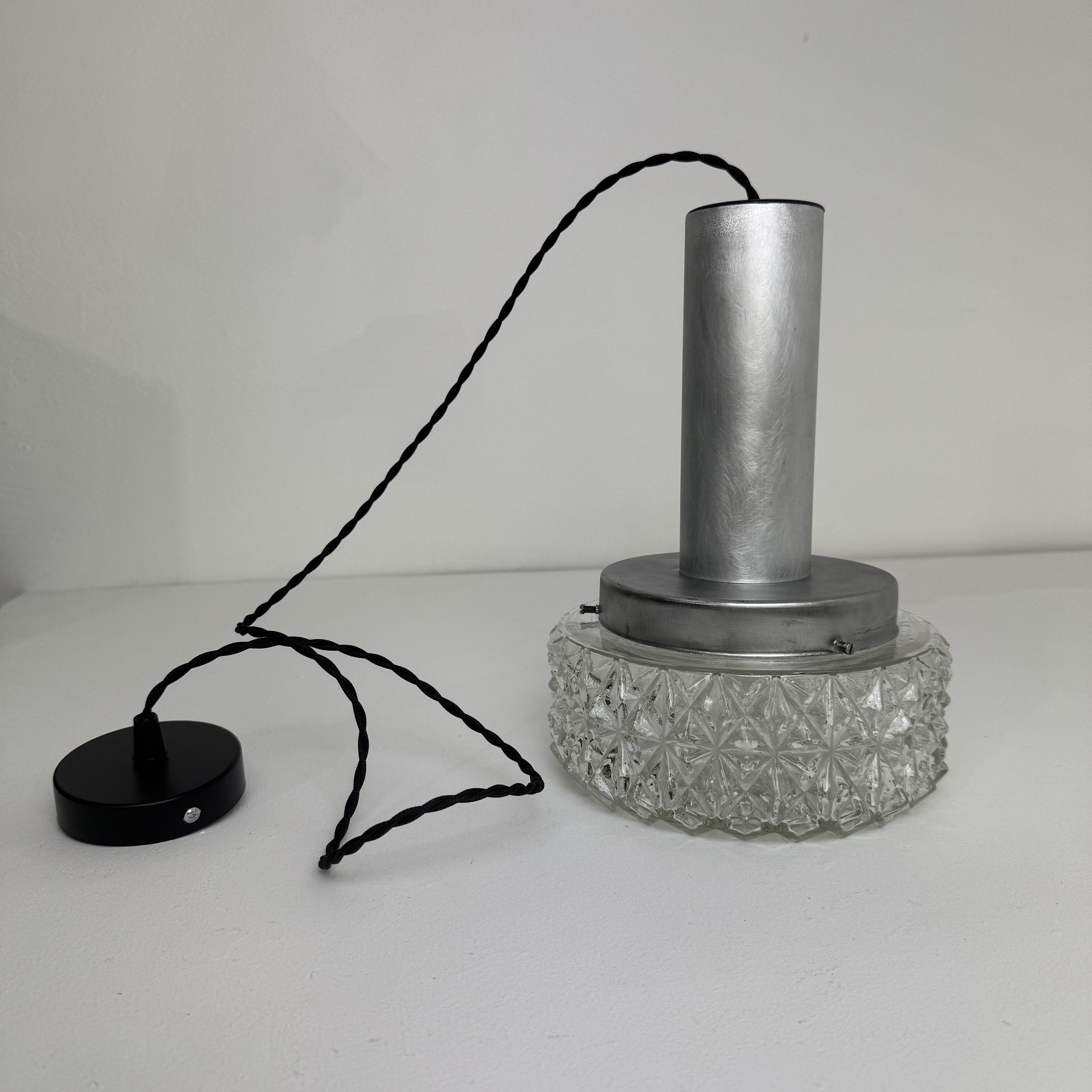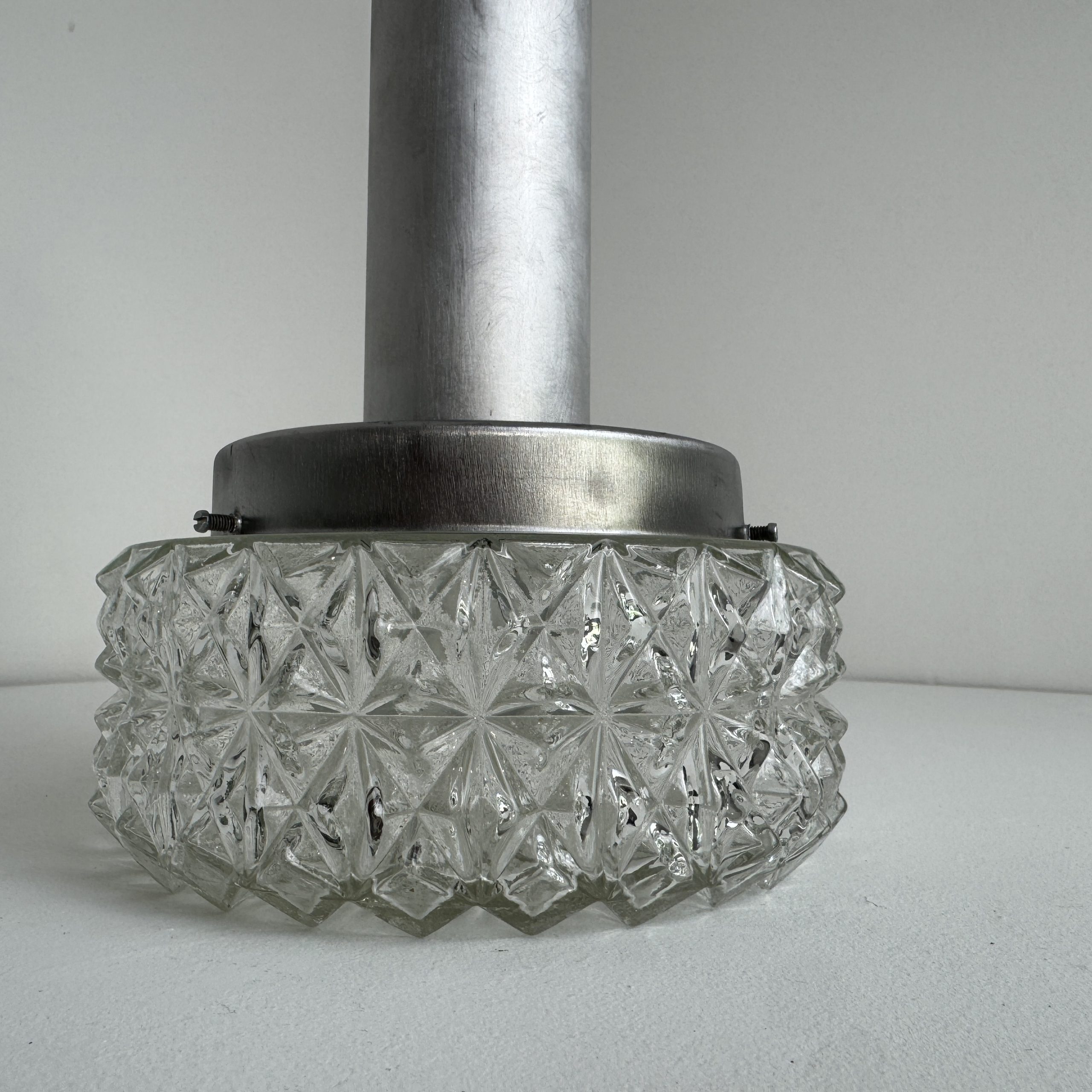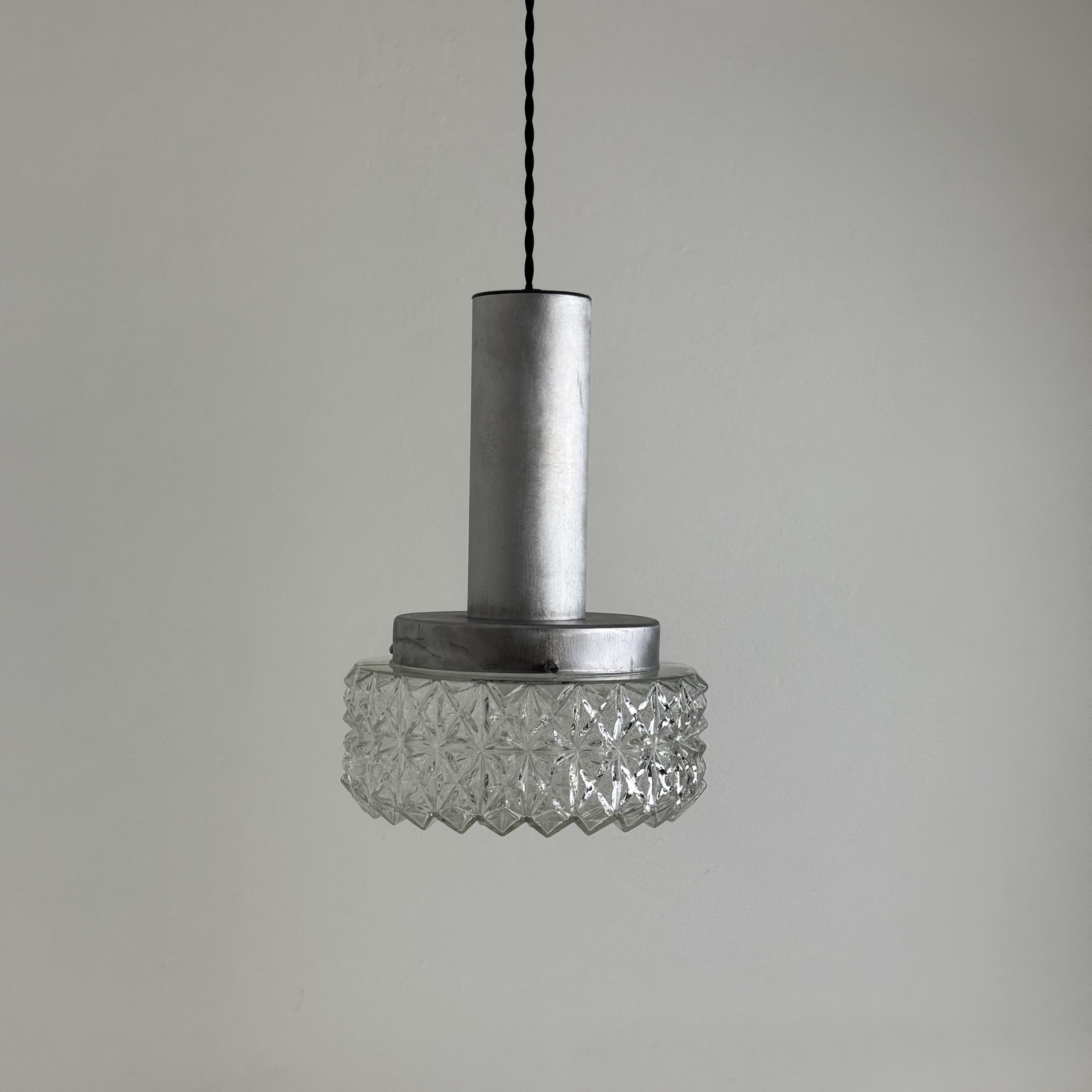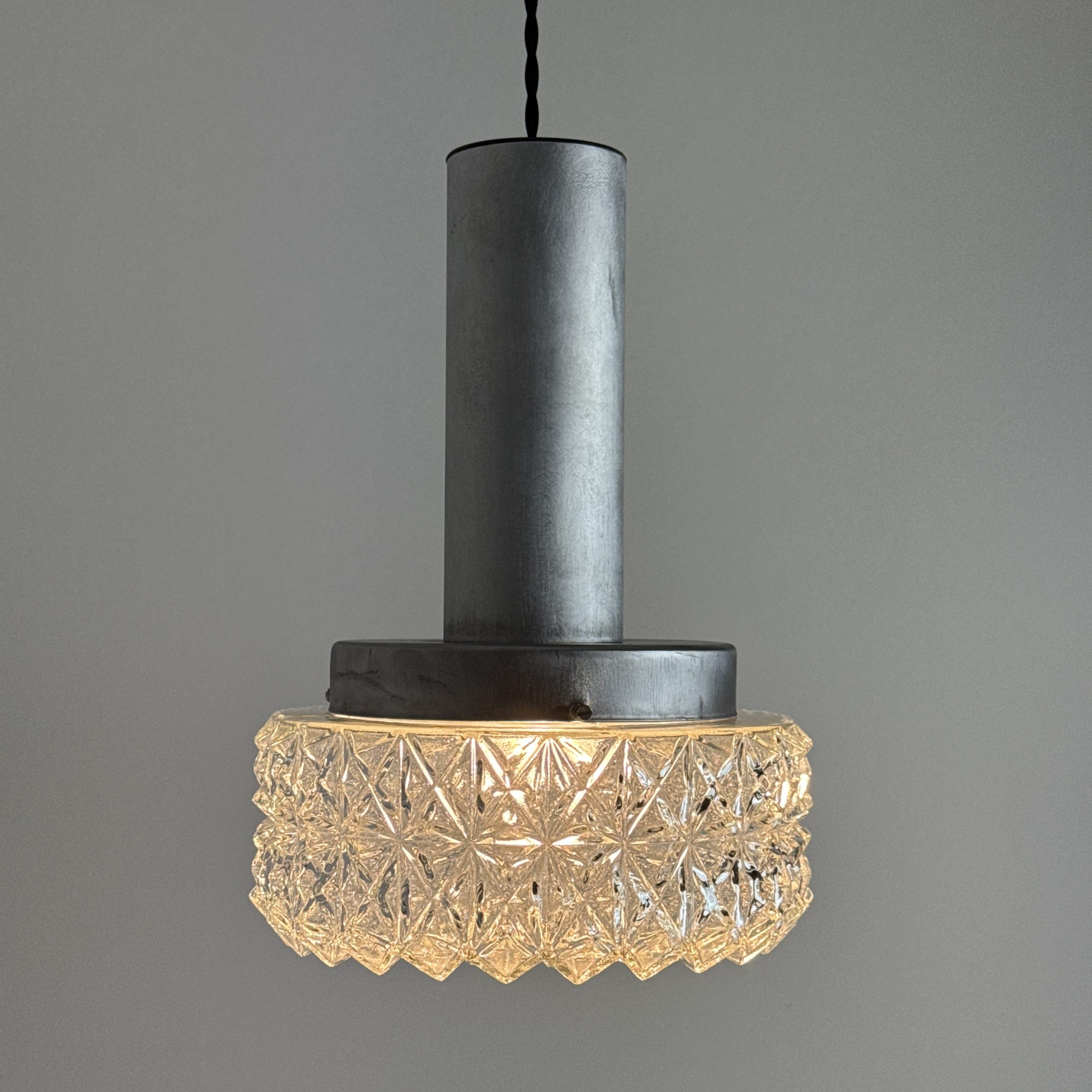 Magnifique suspension scandinave en métal et verre « pointe de diamants ». En bel état général. A noter quelques traces liées à son passé.