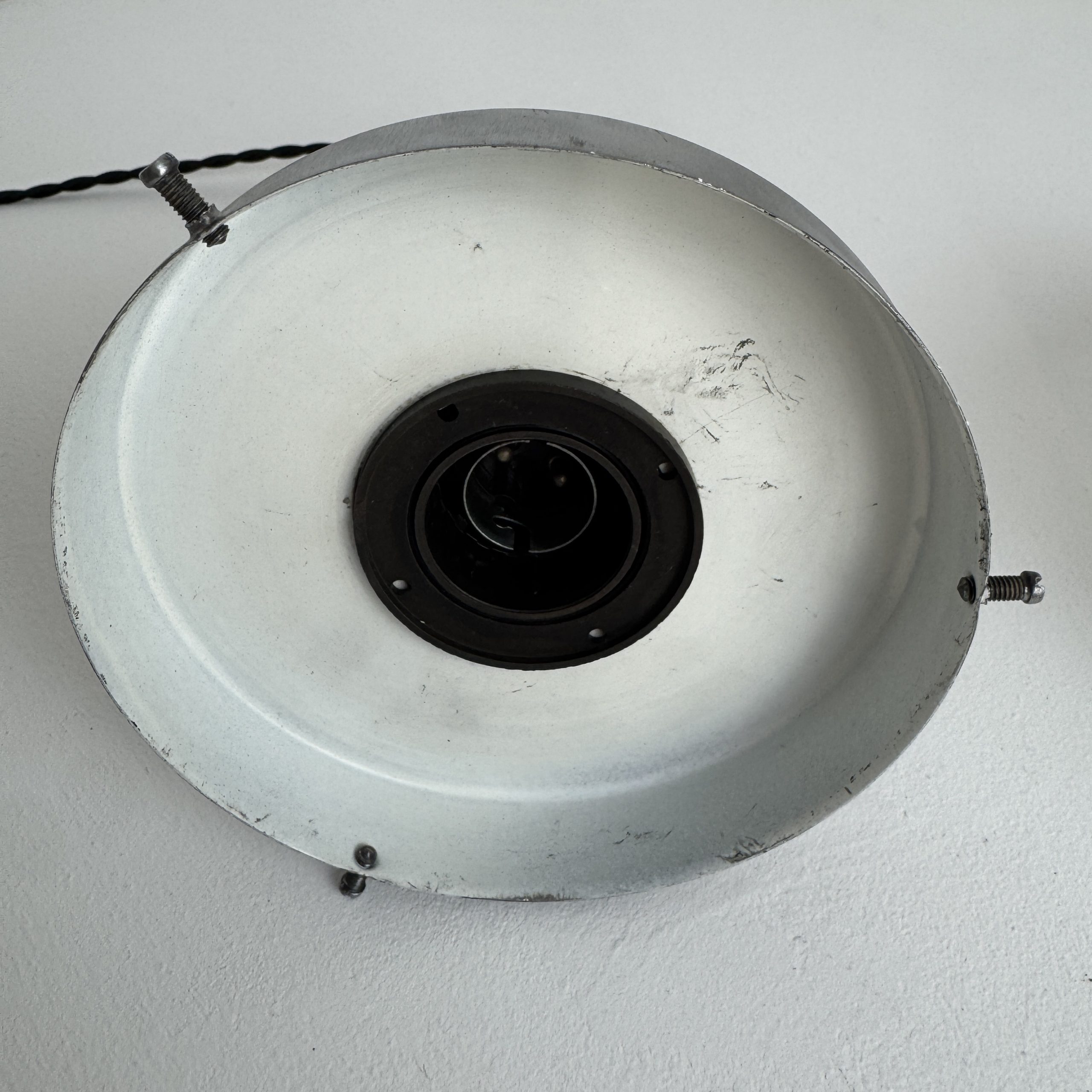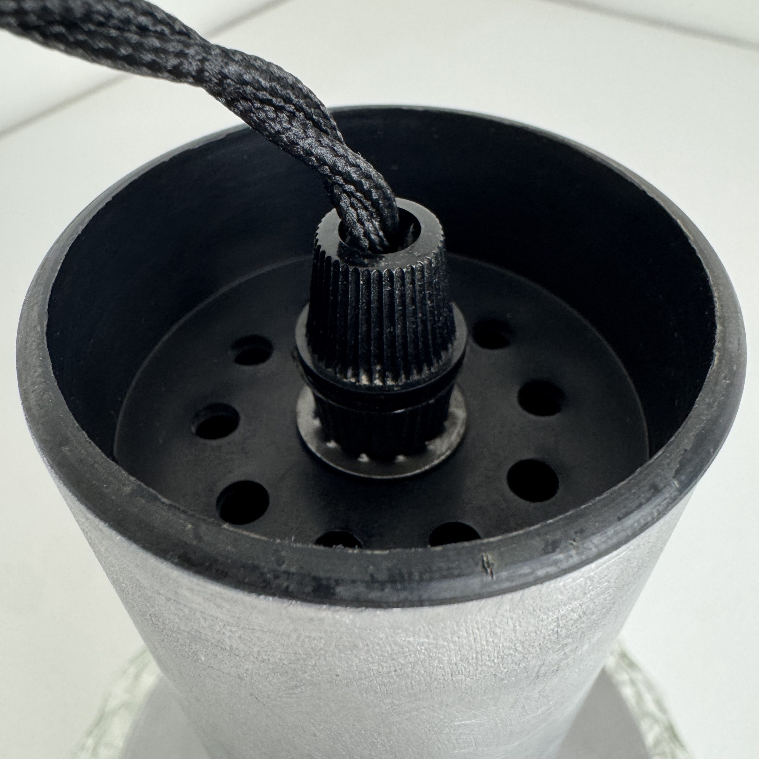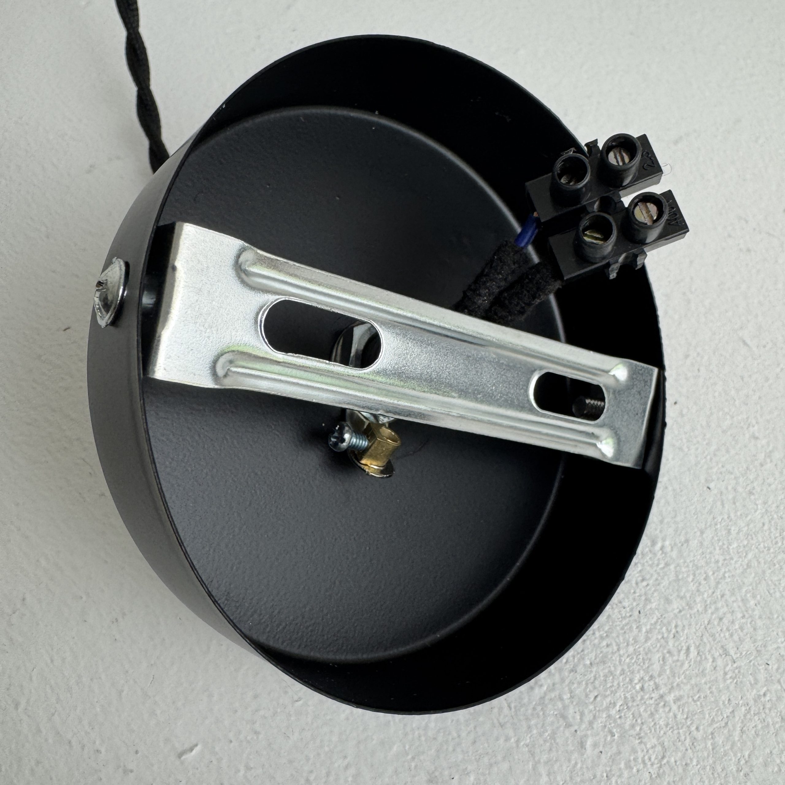 Branchement par domino. Fil noir en tissu tressé et rosace de fixation en métal.