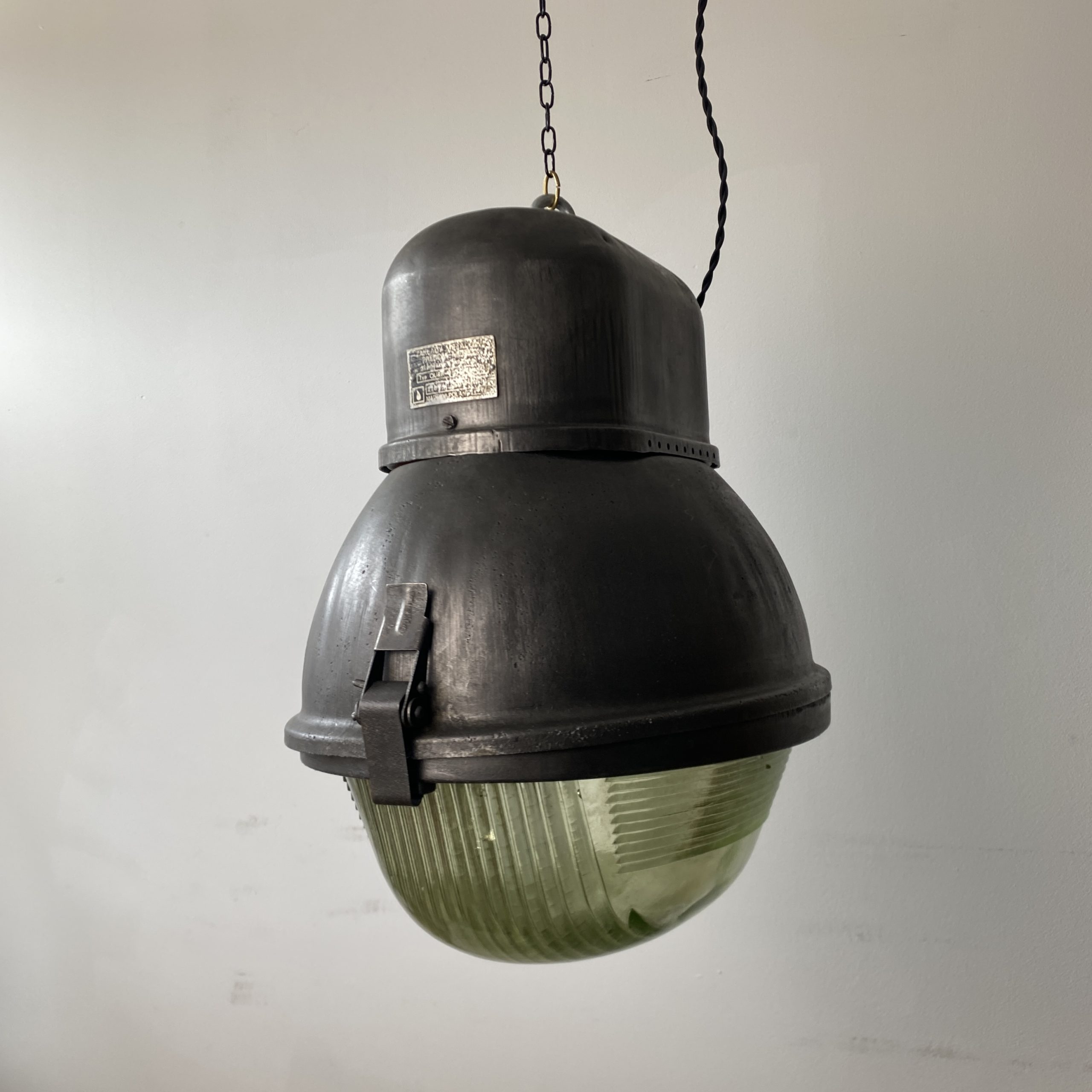 Imposante et lourde suspension ou plafonnier industriel d’origine polonaise. En aluminium et verre épais.