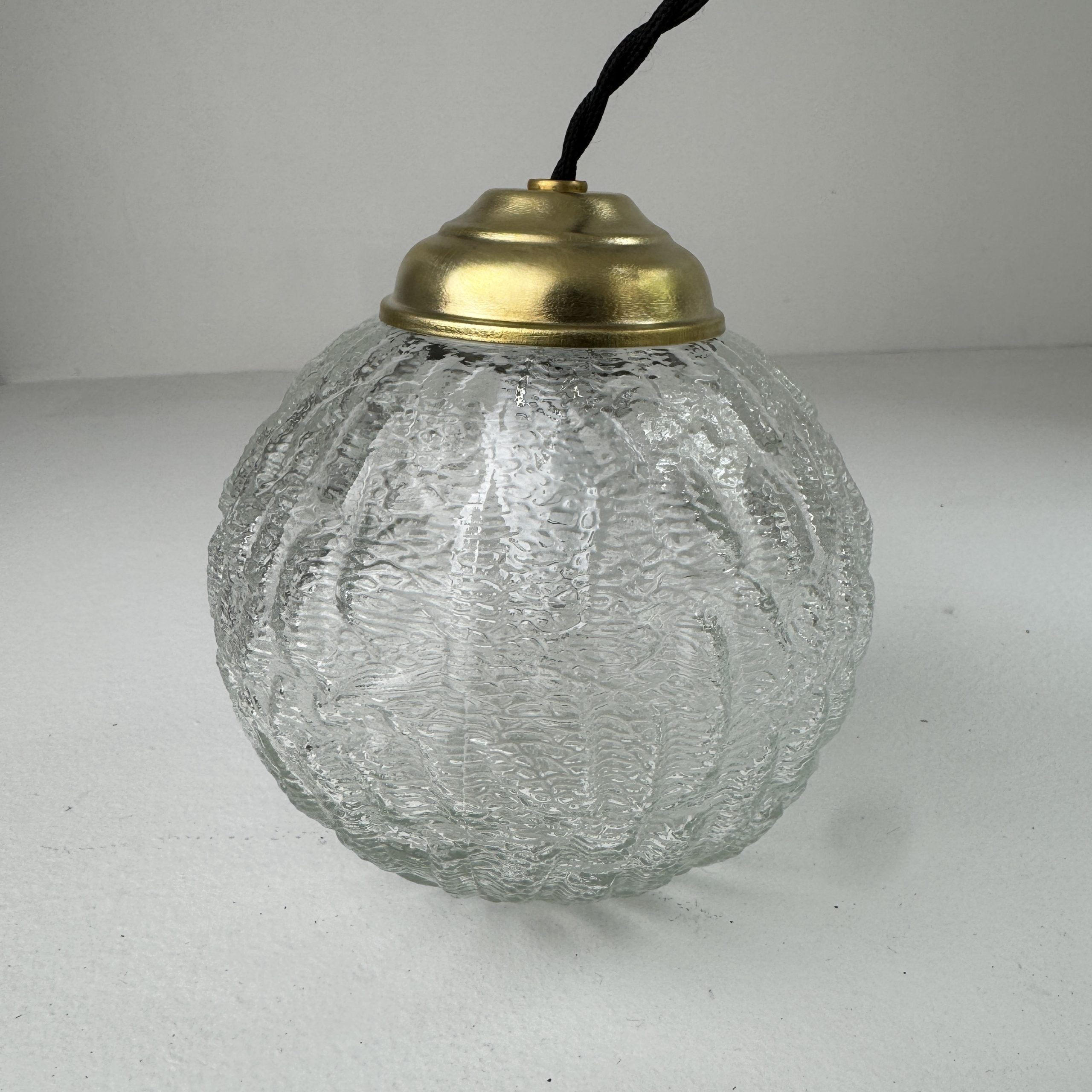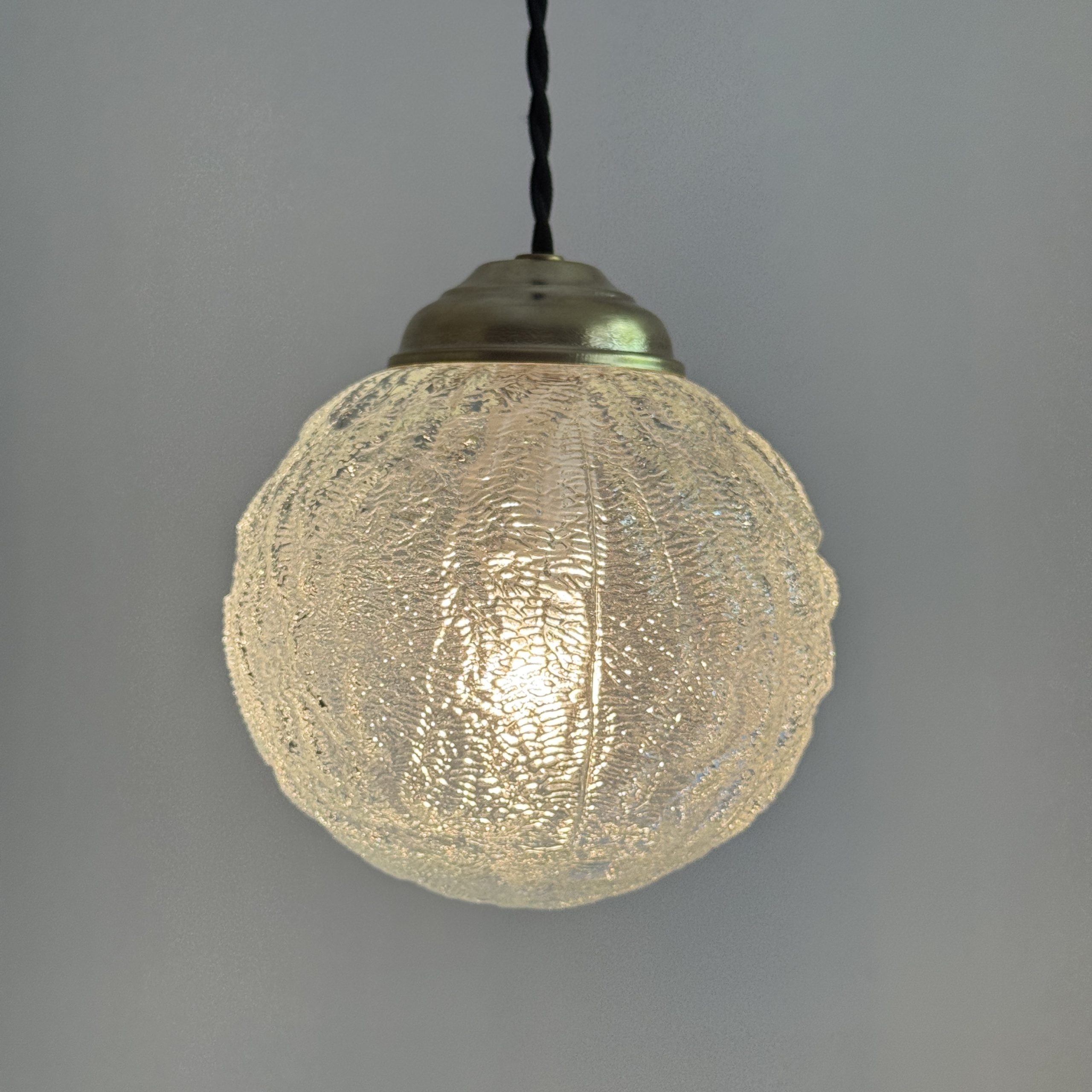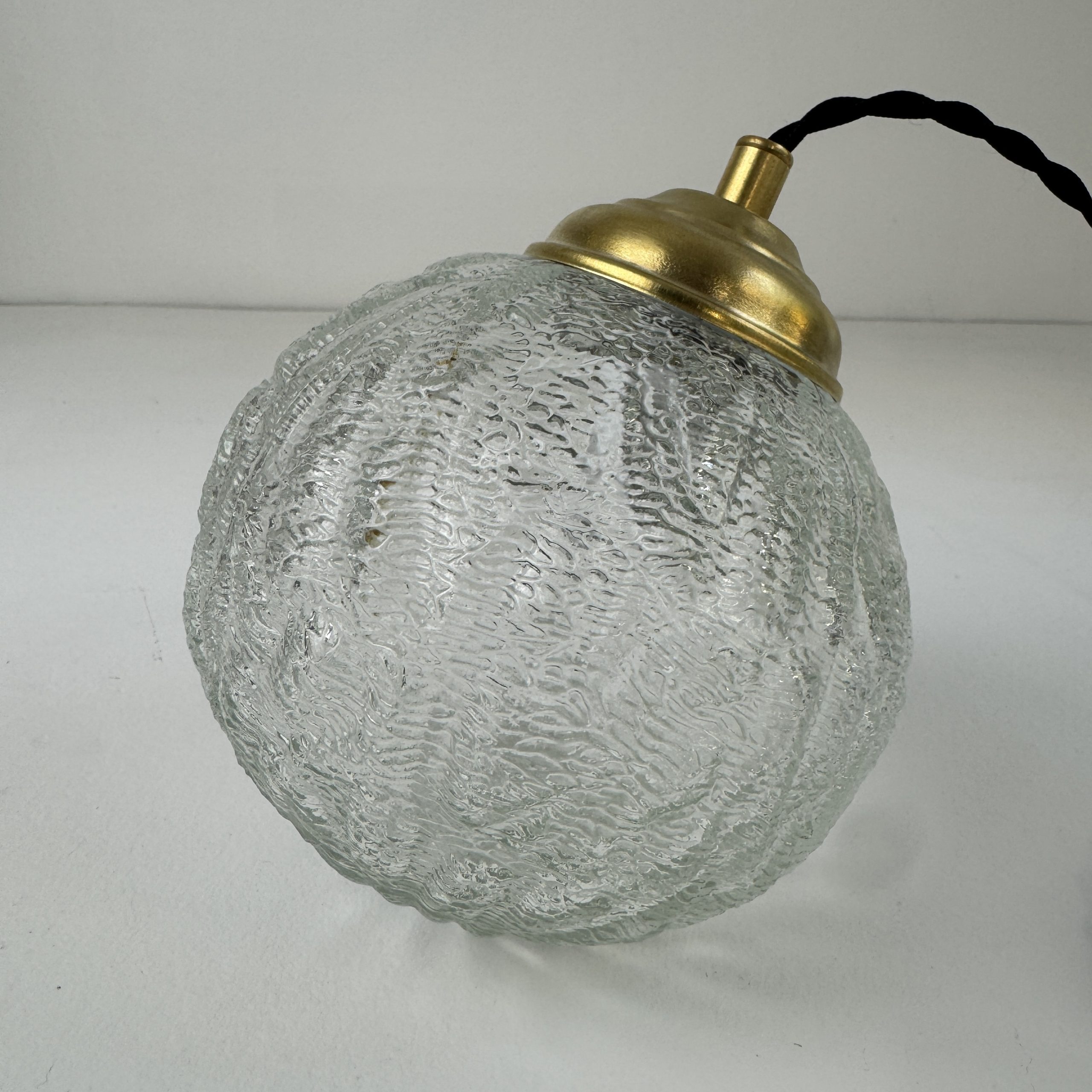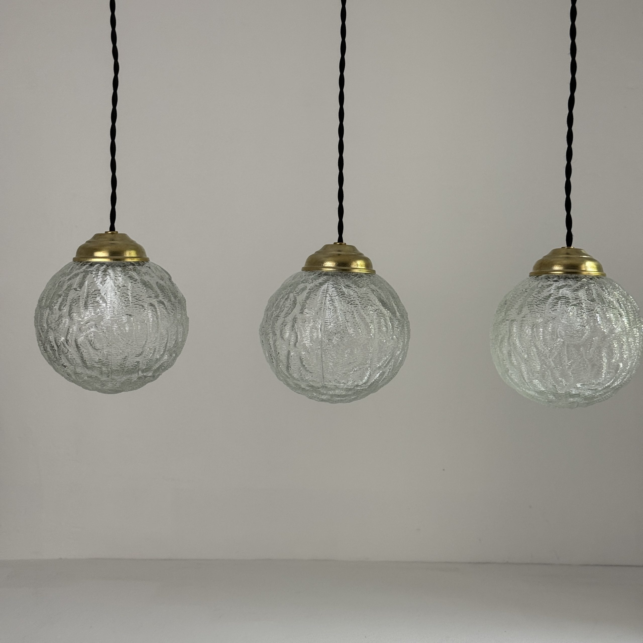 Trio de 3 suspensions rondes en verre texturé.Bel effet de lumière. Rosace de fixation en métal.