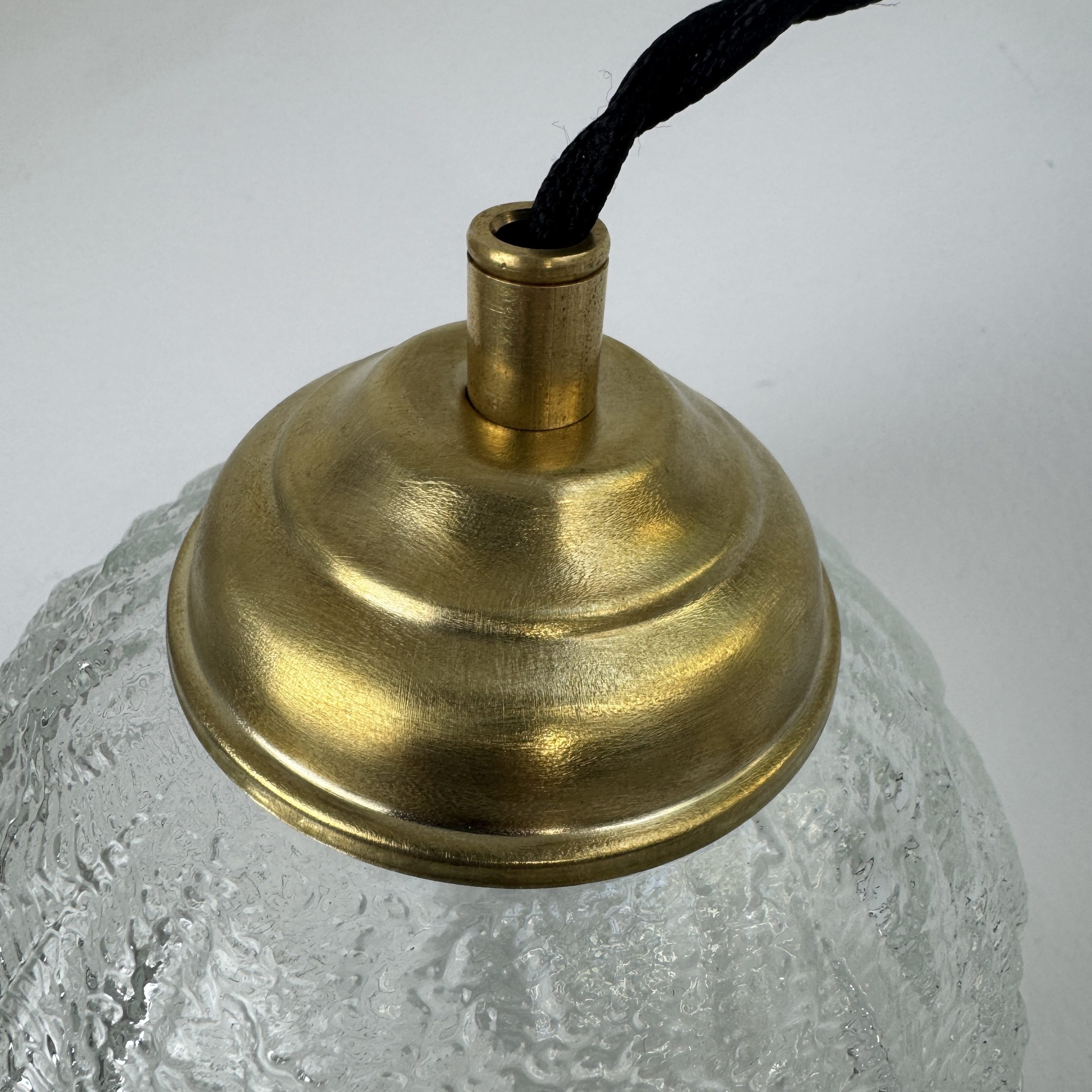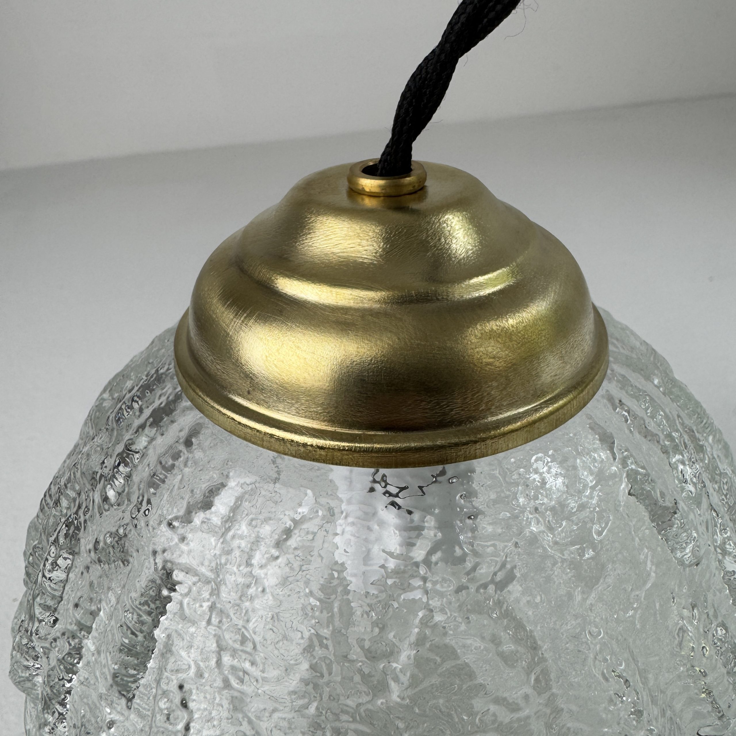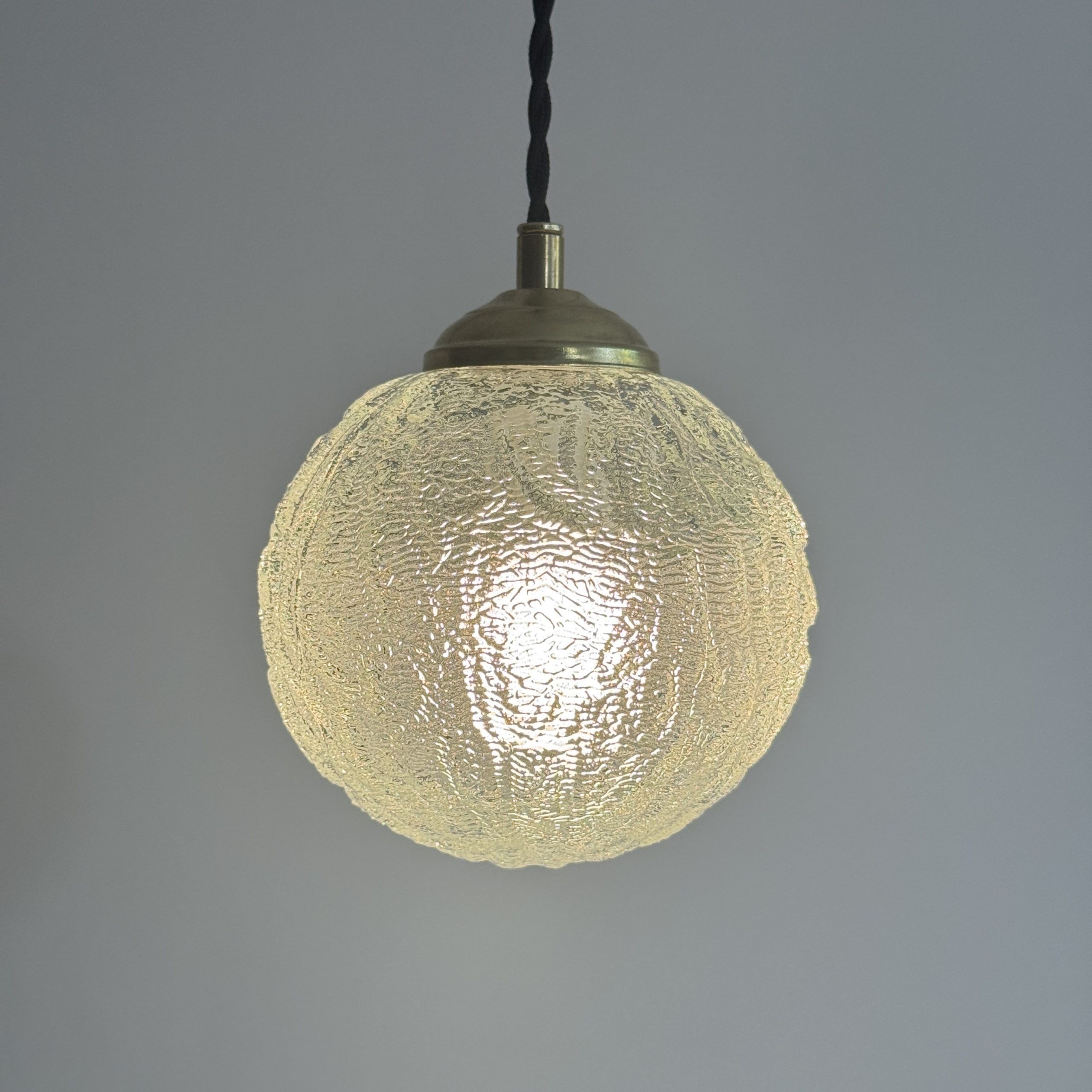 Trio de 3 suspensions rondes en verre texturé.Bel effet de lumière. Rosace de fixation en métal.