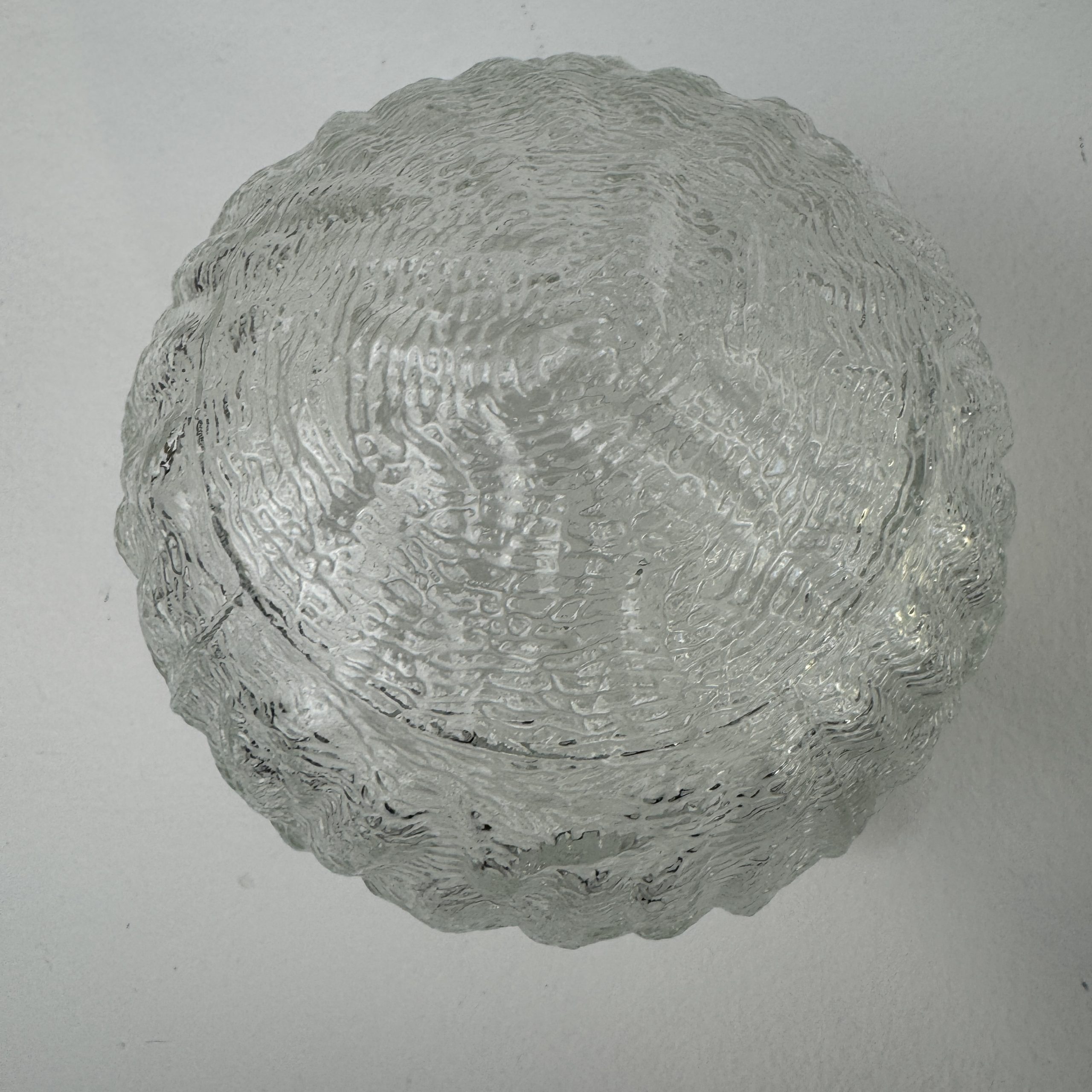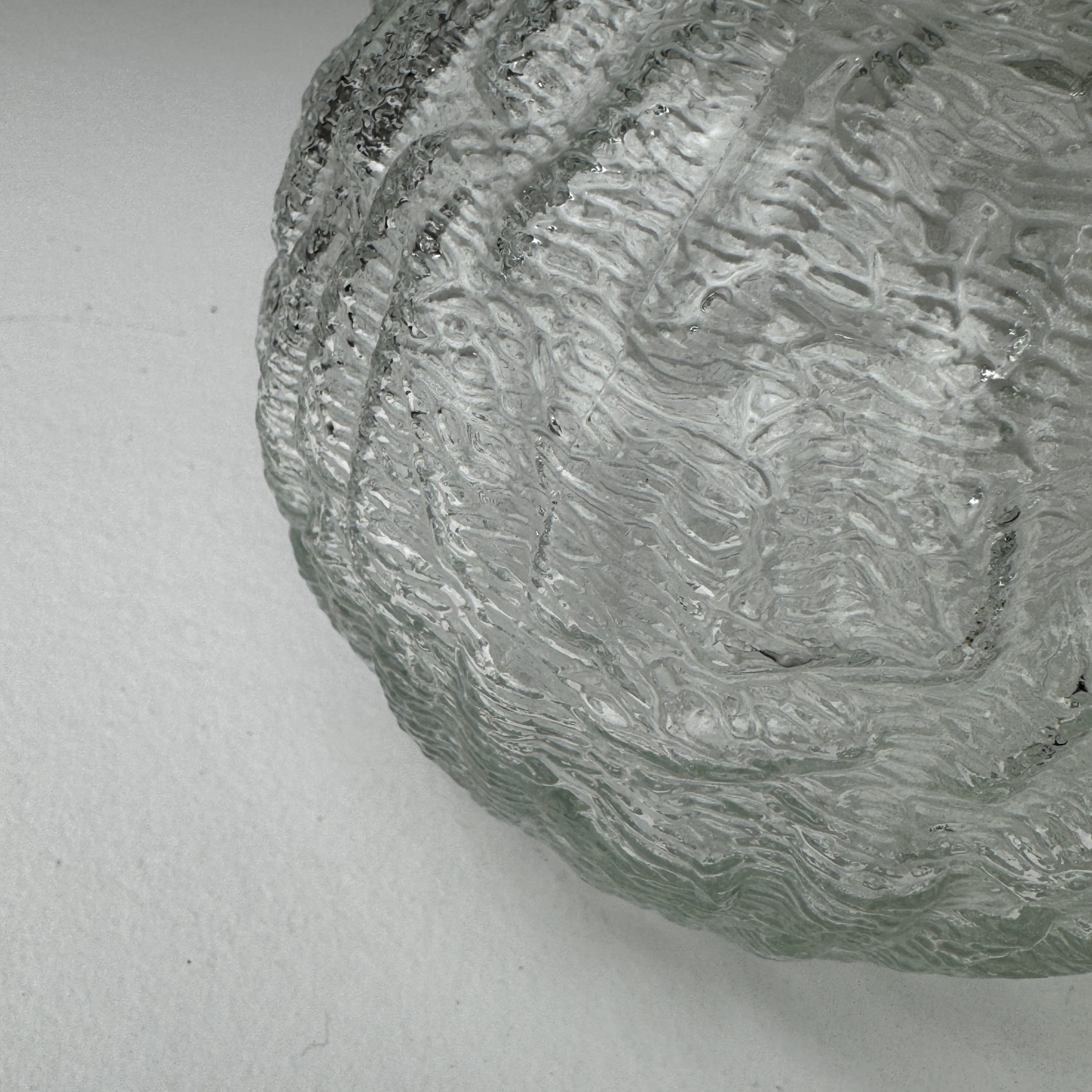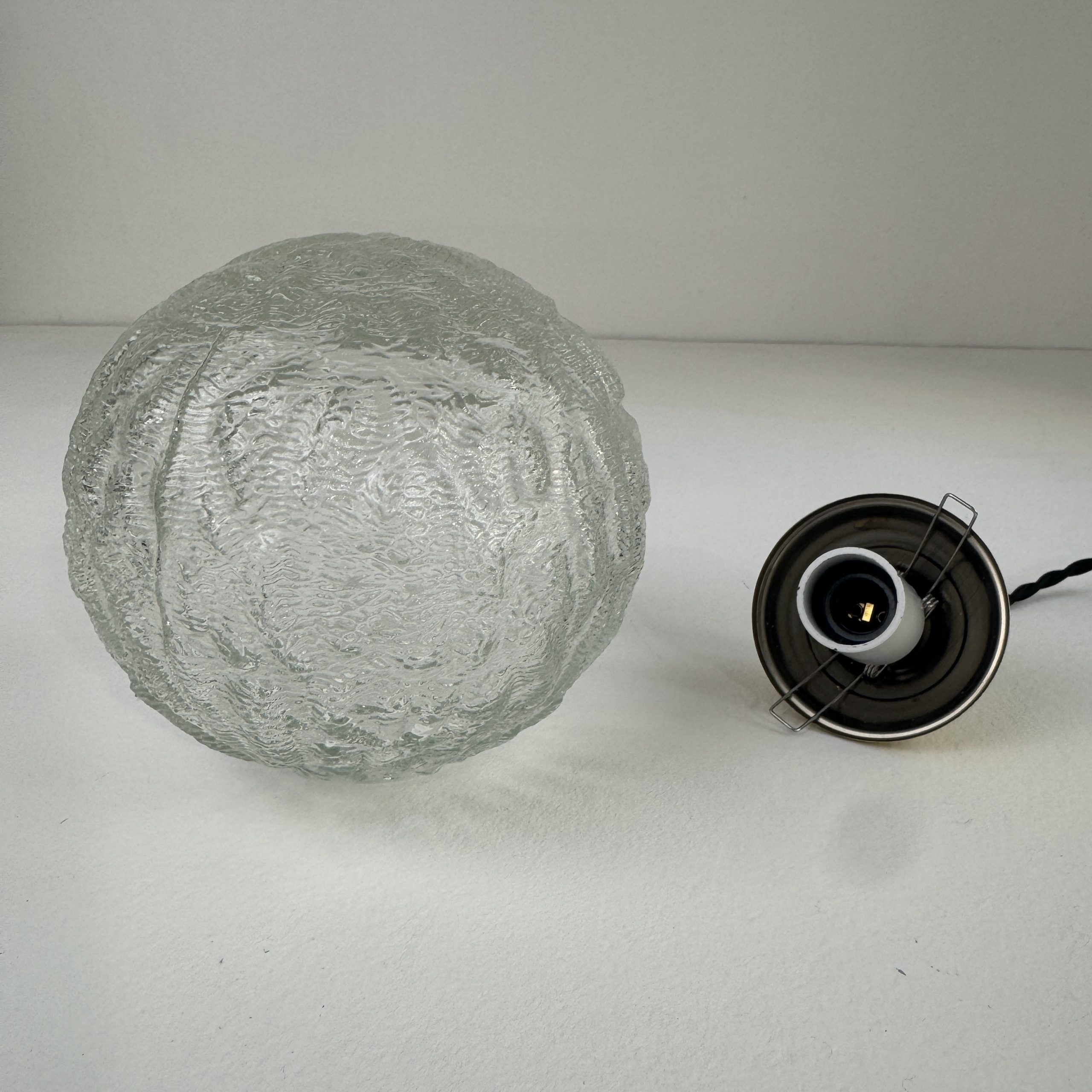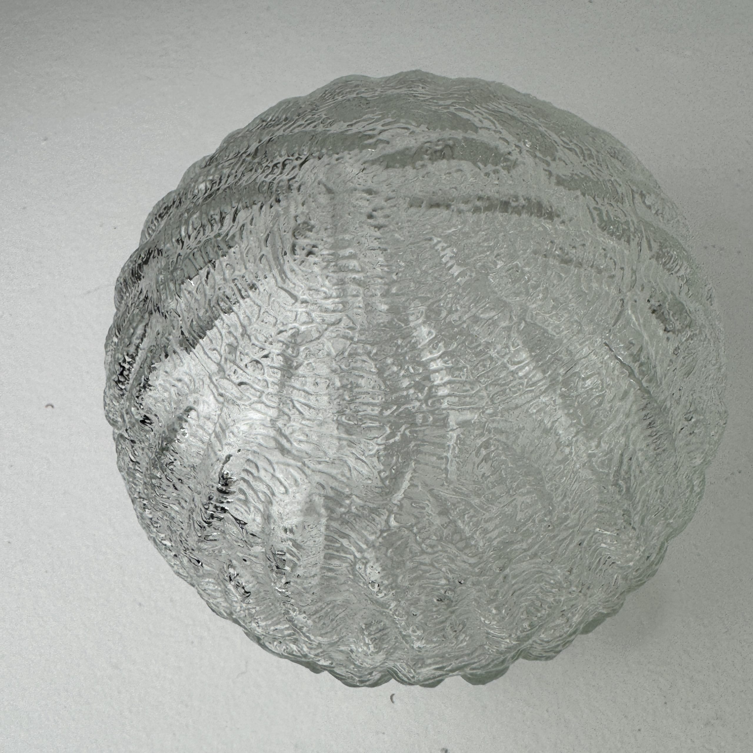 Trio de 3 suspensions rondes en verre texturé.Bel effet de lumière. Rosace de fixation en métal.
