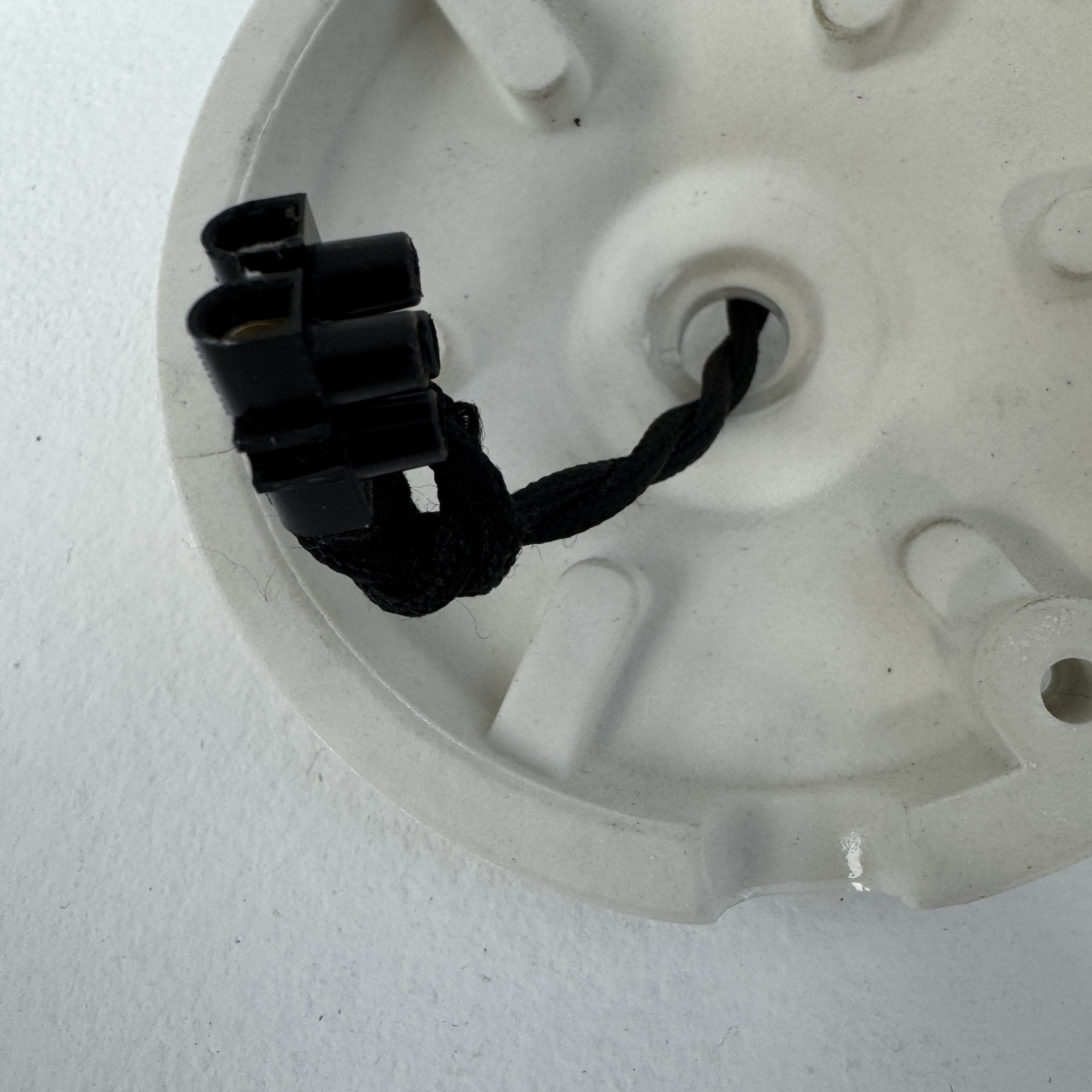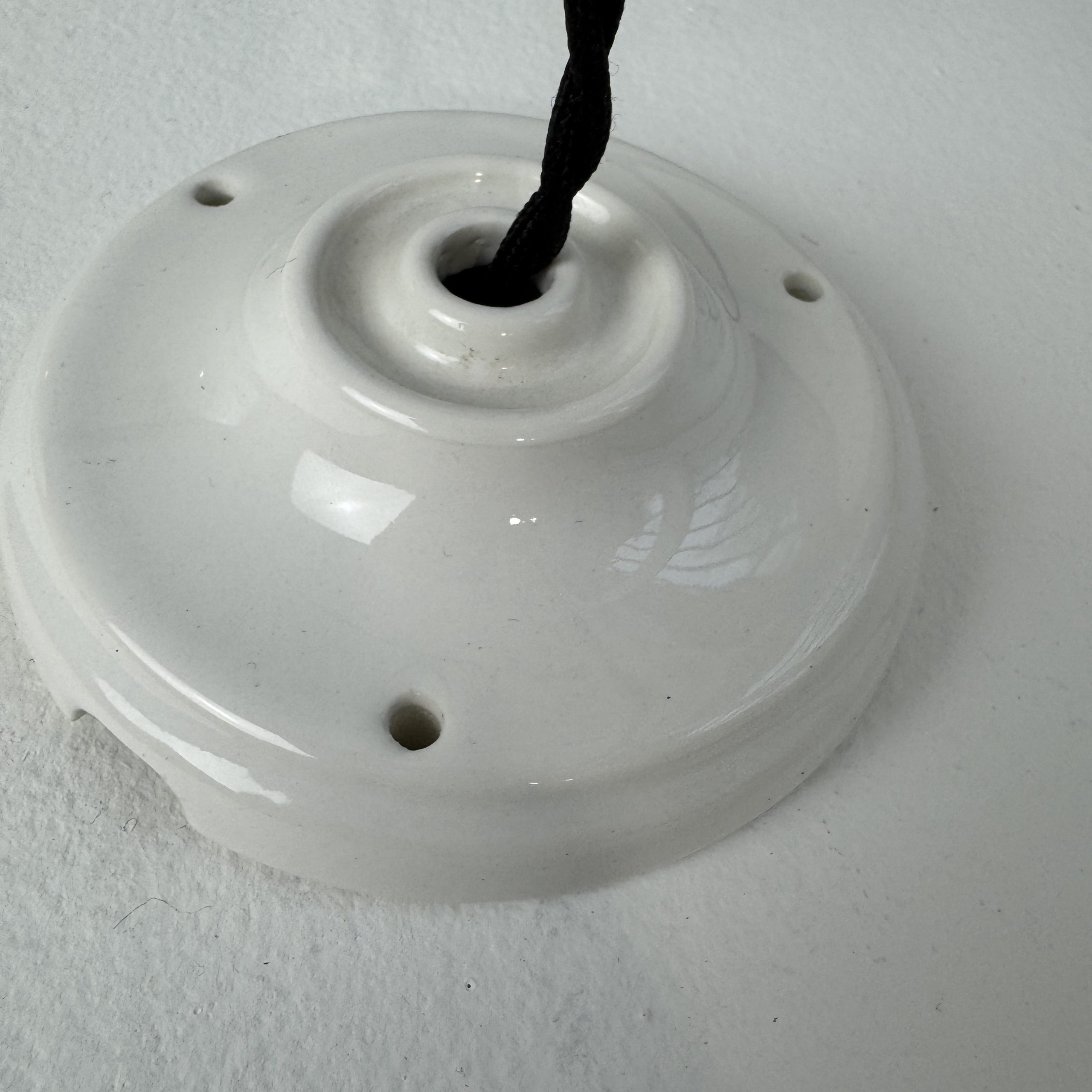 Branchement par domino. Fil noir en tissu tressé et rosace de fixation en céramique.