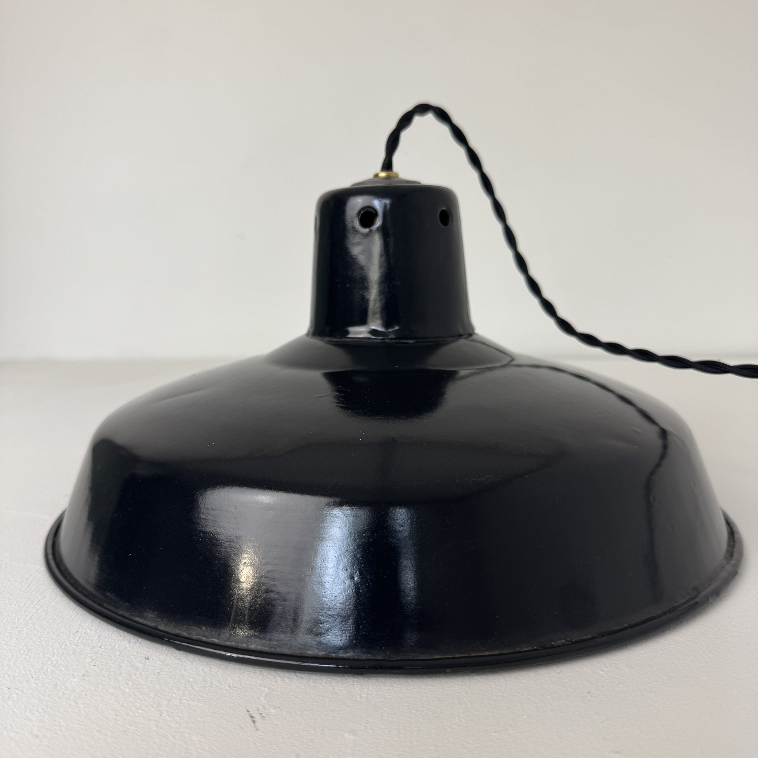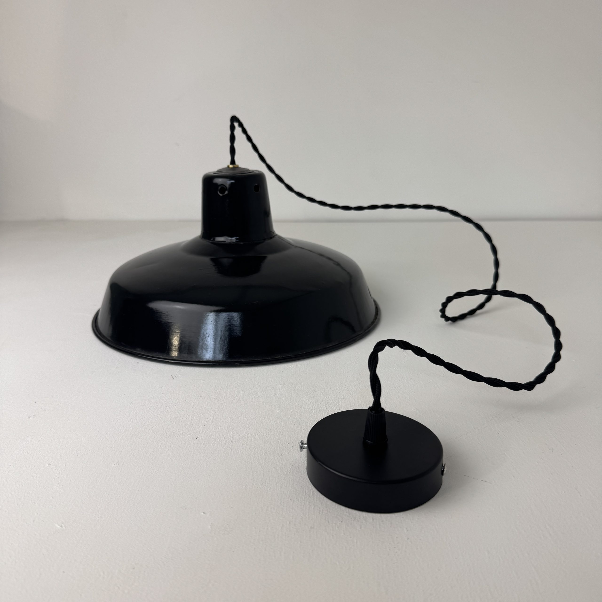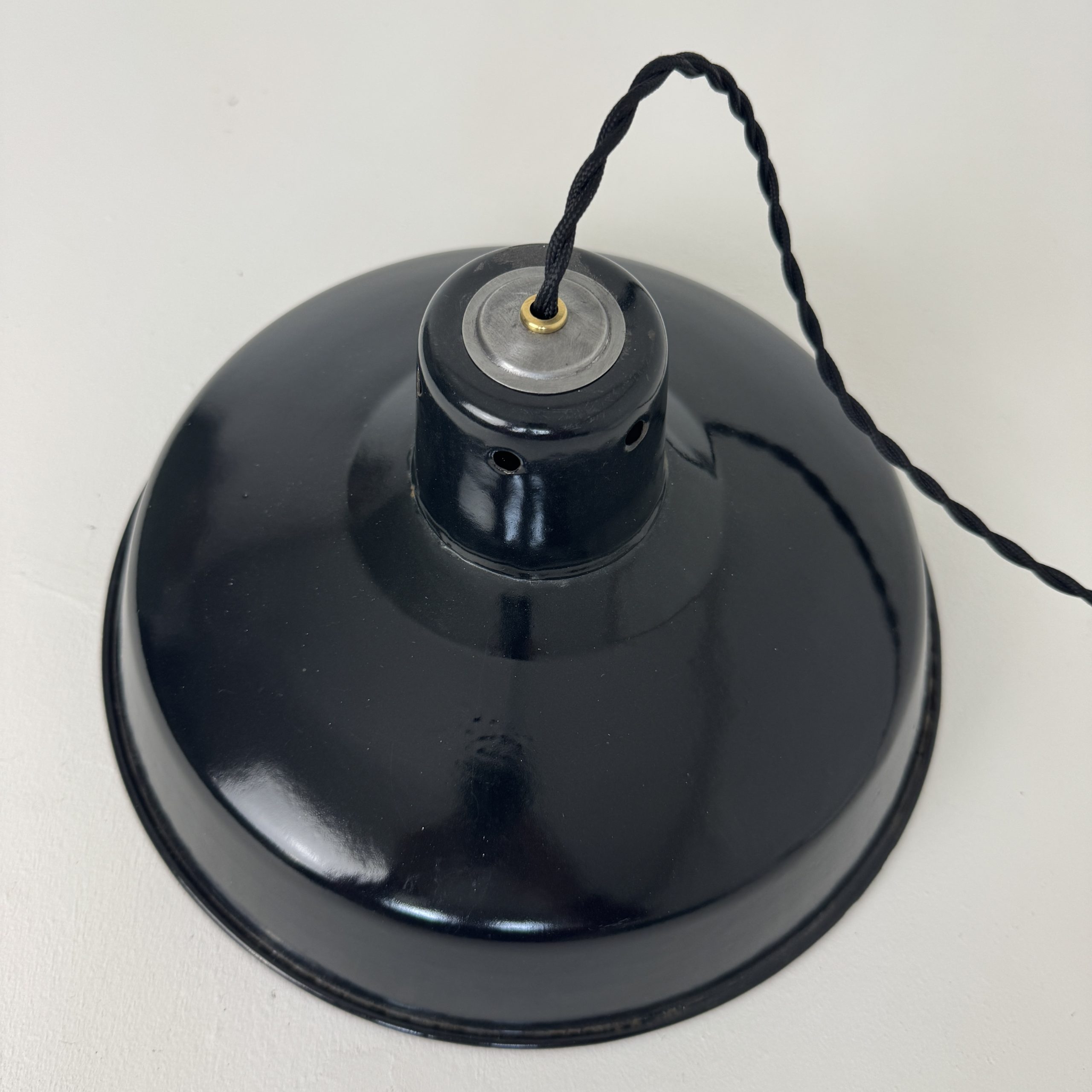 Ancienne suspension industrielle. en tôle émaillée noire. Année 1950. En bel état. A noter des sauts d’emails et traces de rouille.
