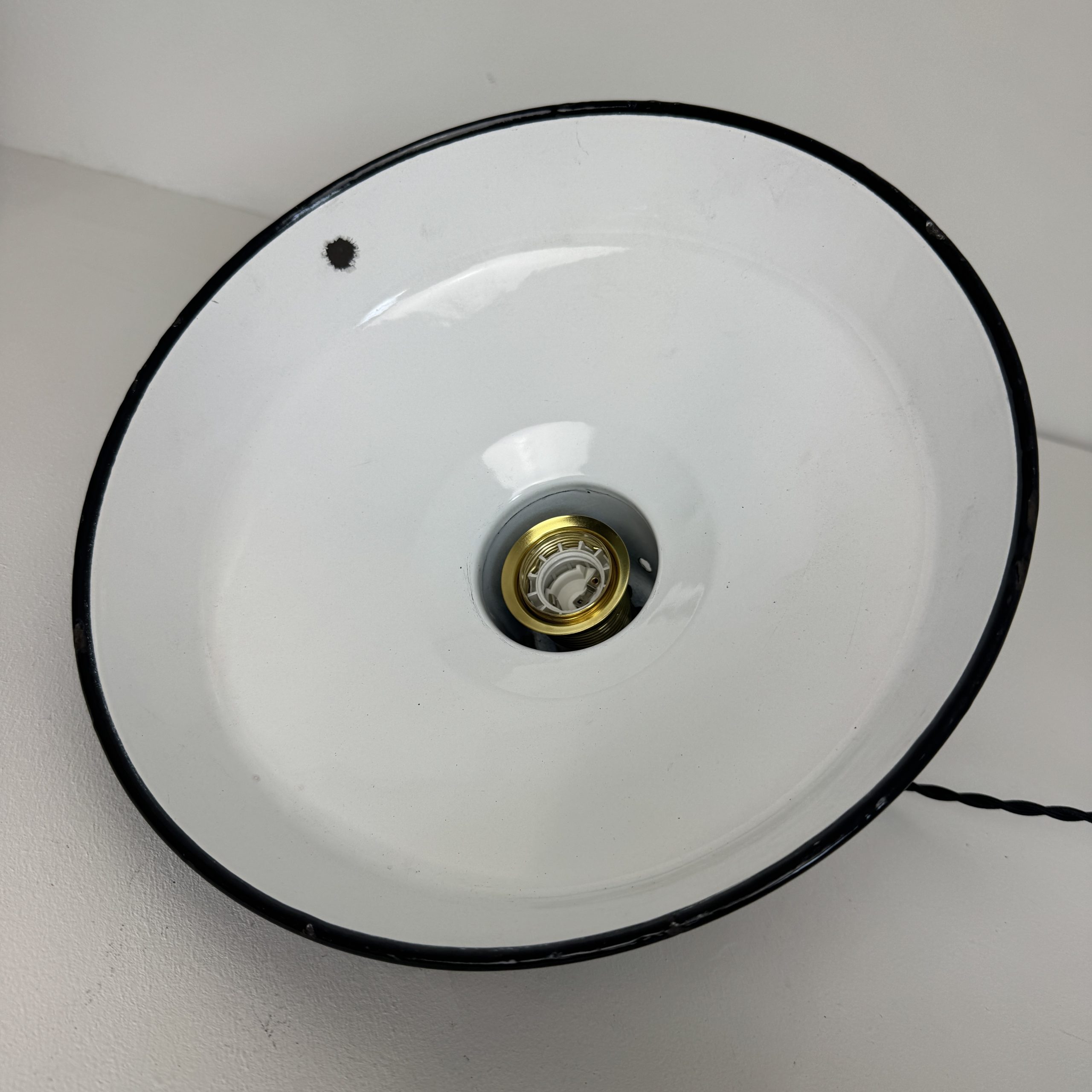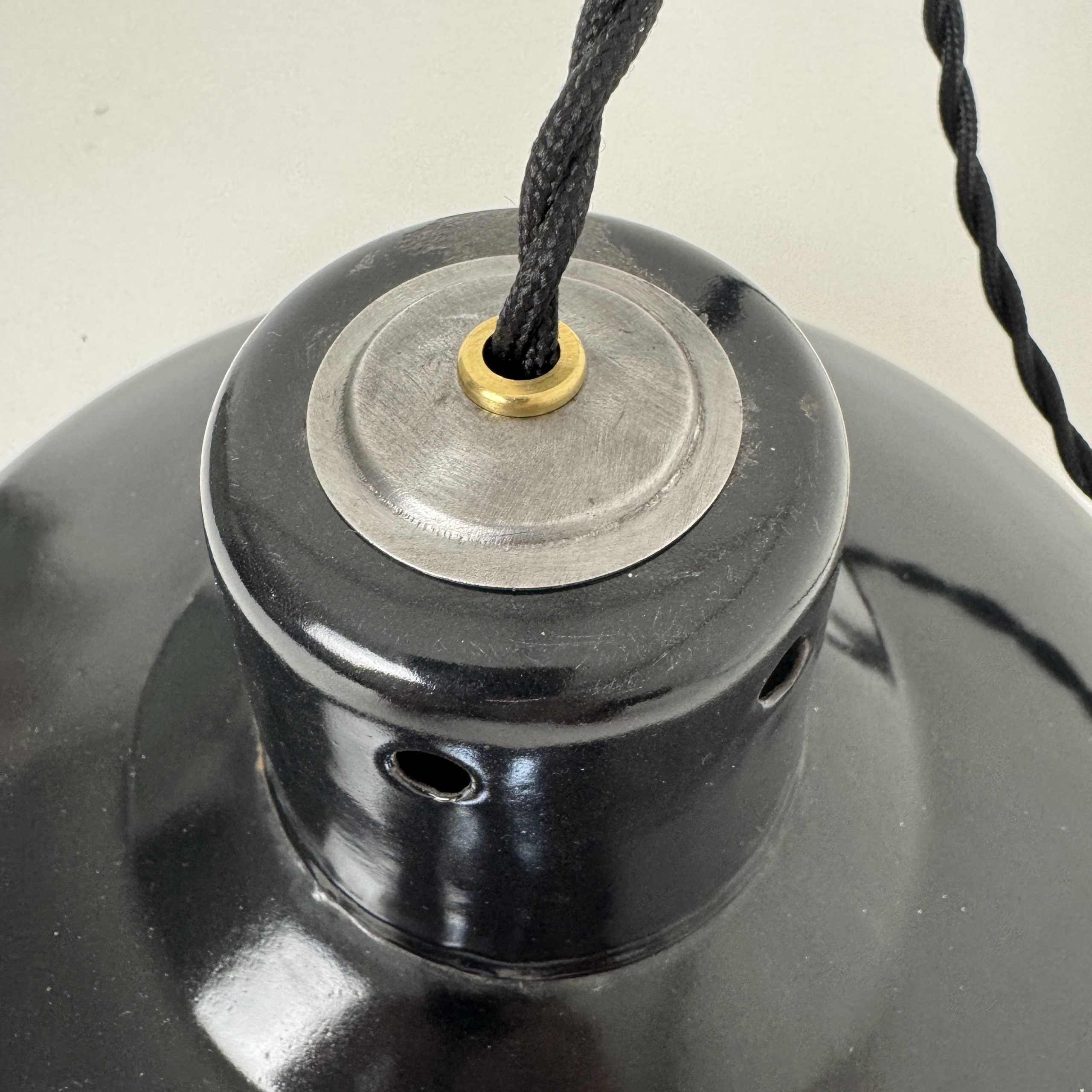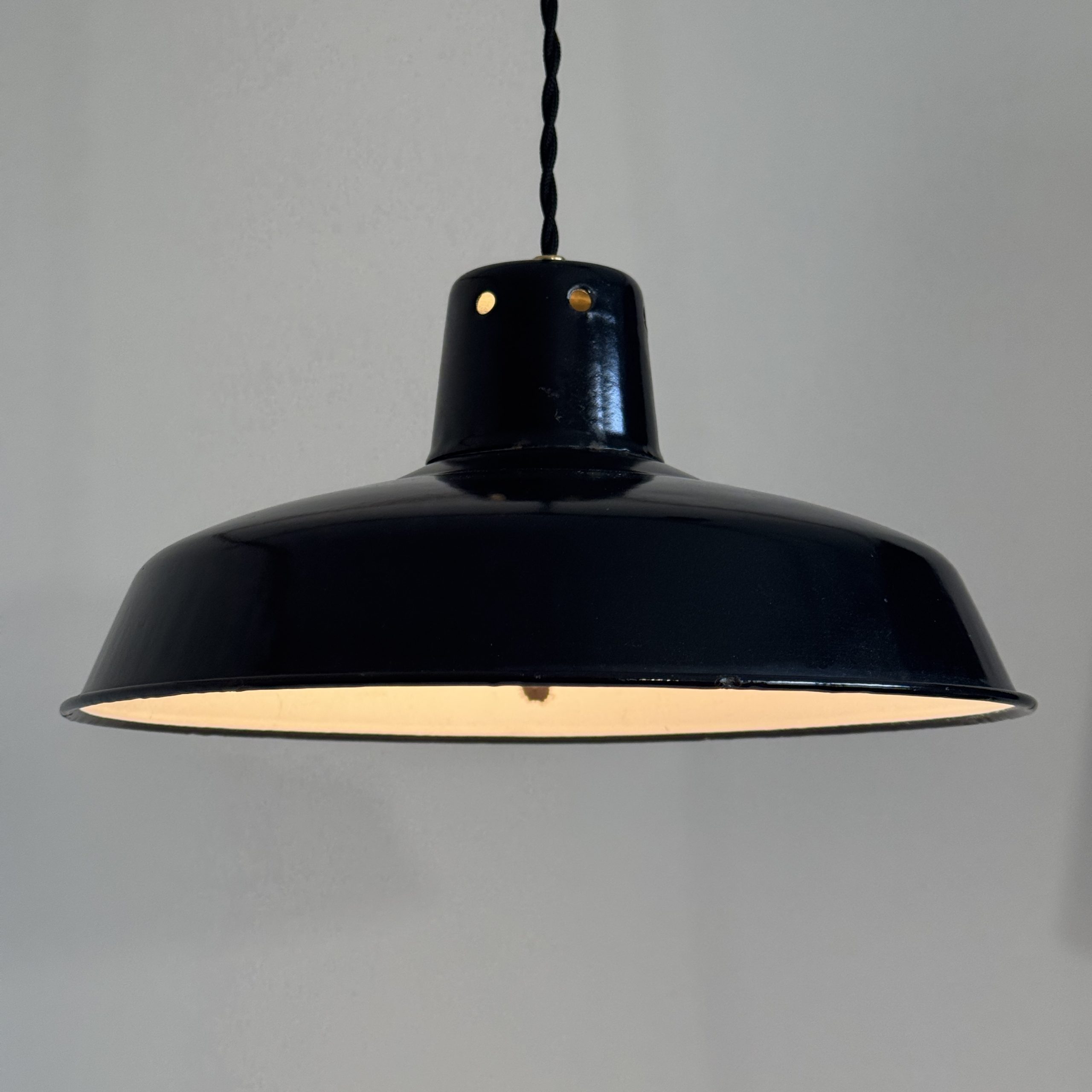 Ancienne suspension industrielle. en tôle émaillée noire. Année 1950. En bel état. A noter des sauts d’emails et traces de rouille.