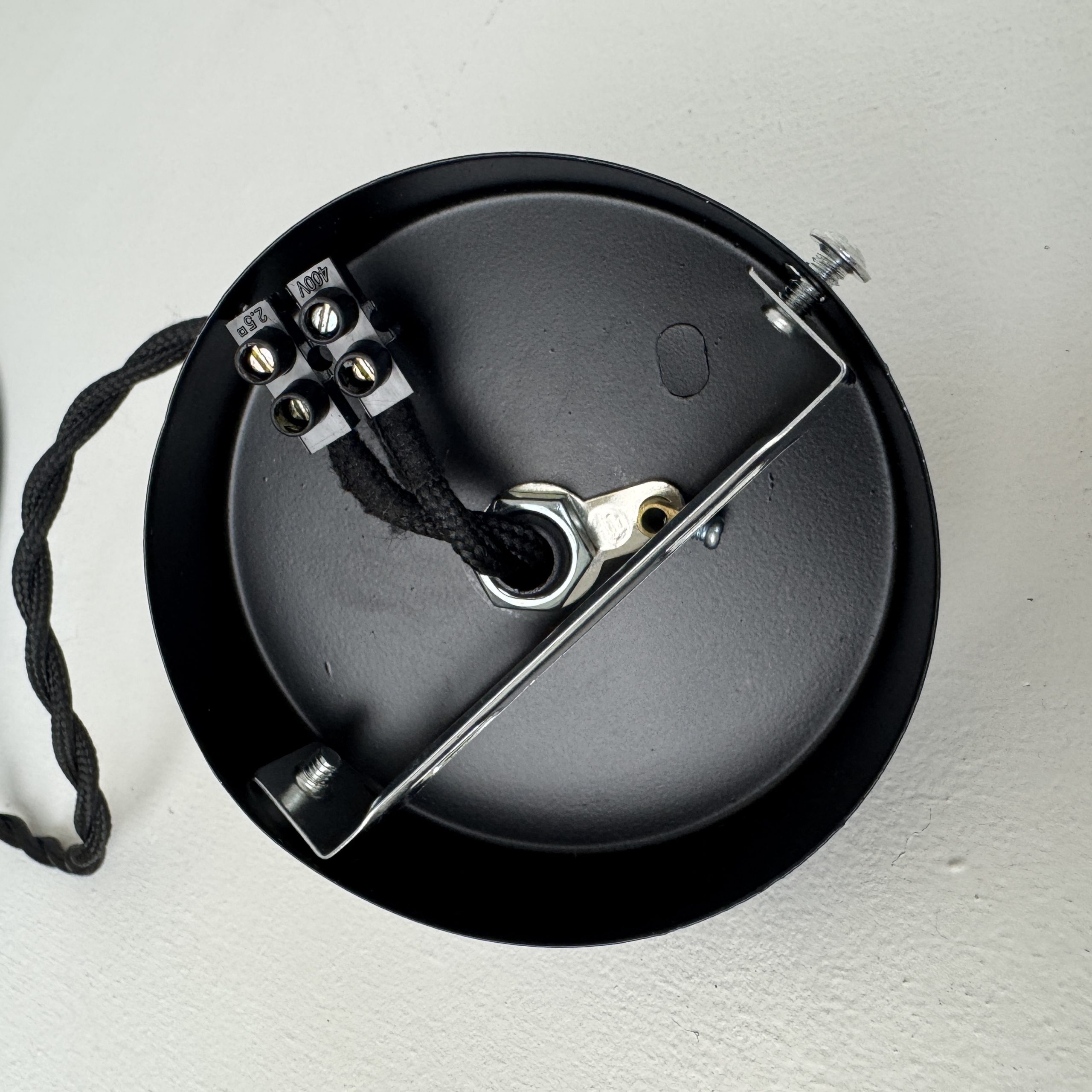 Branchement par domino. Fil noir en tissu tressé et rosace de fixation en métal noir.