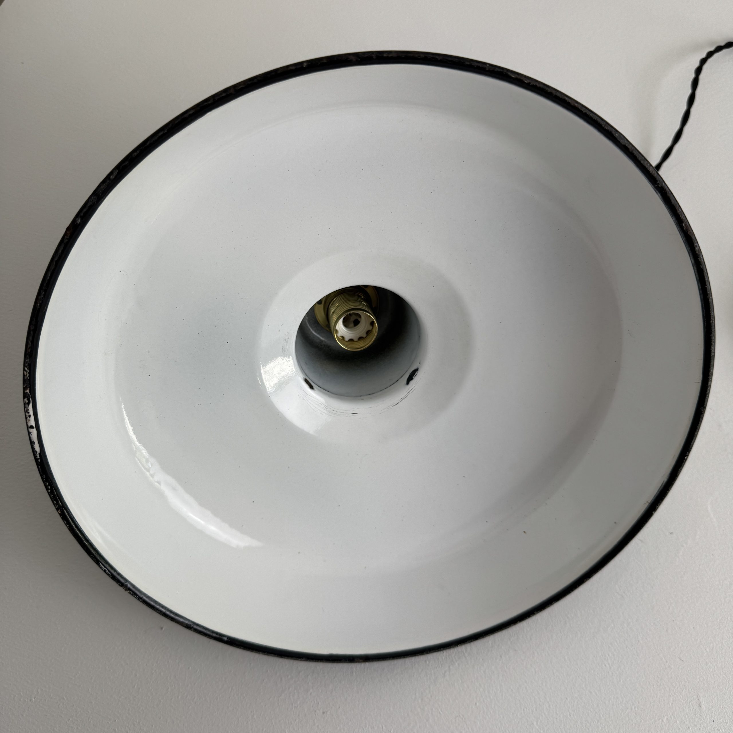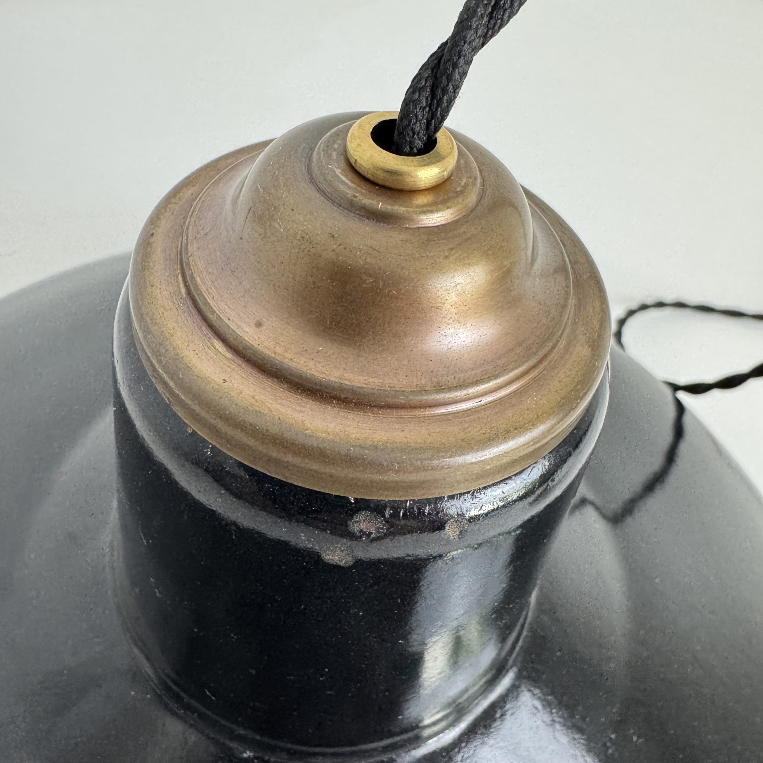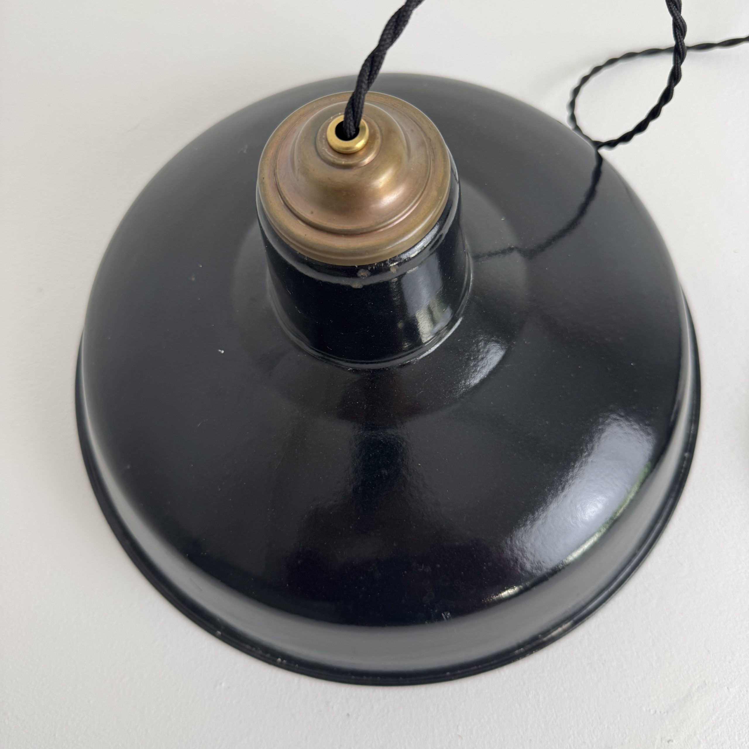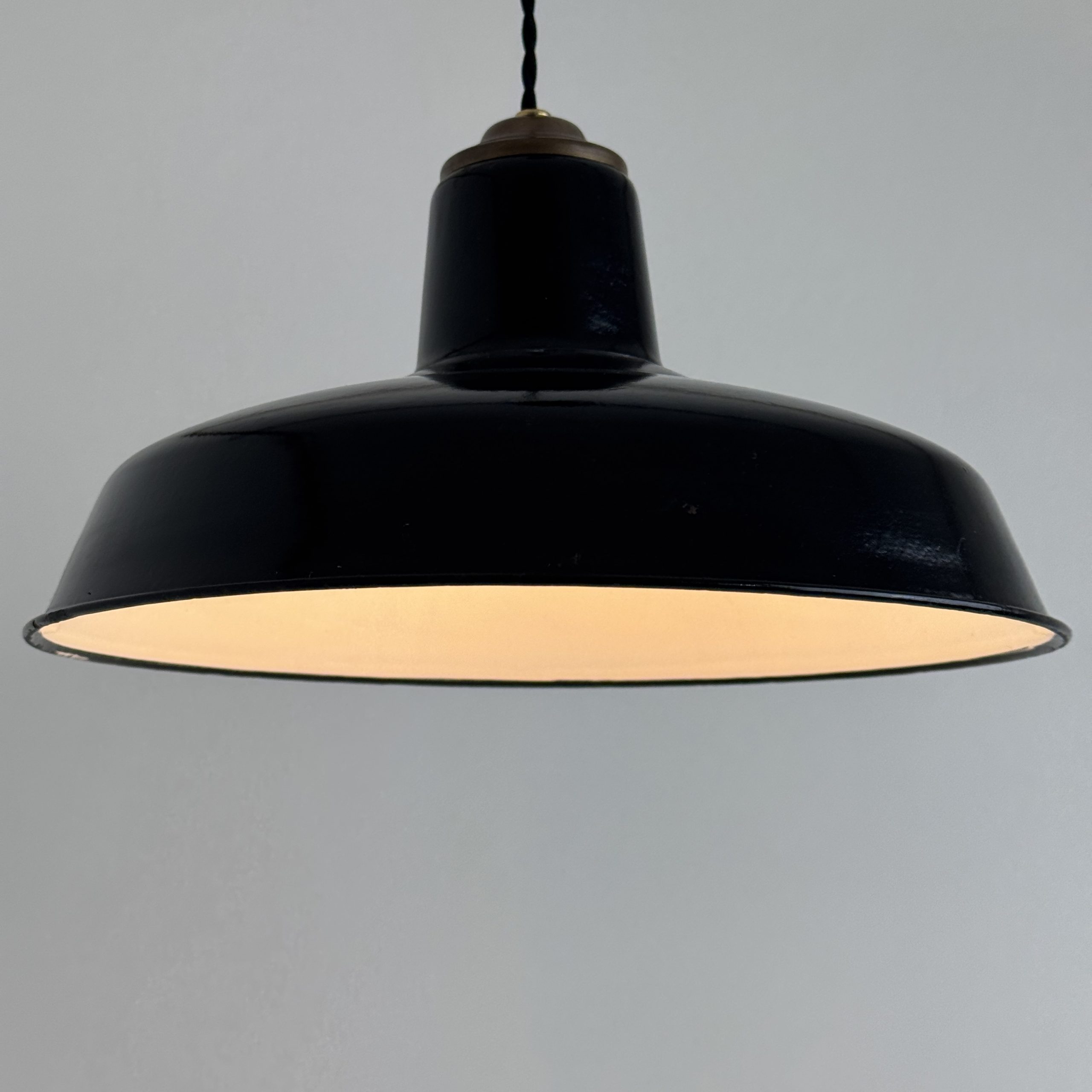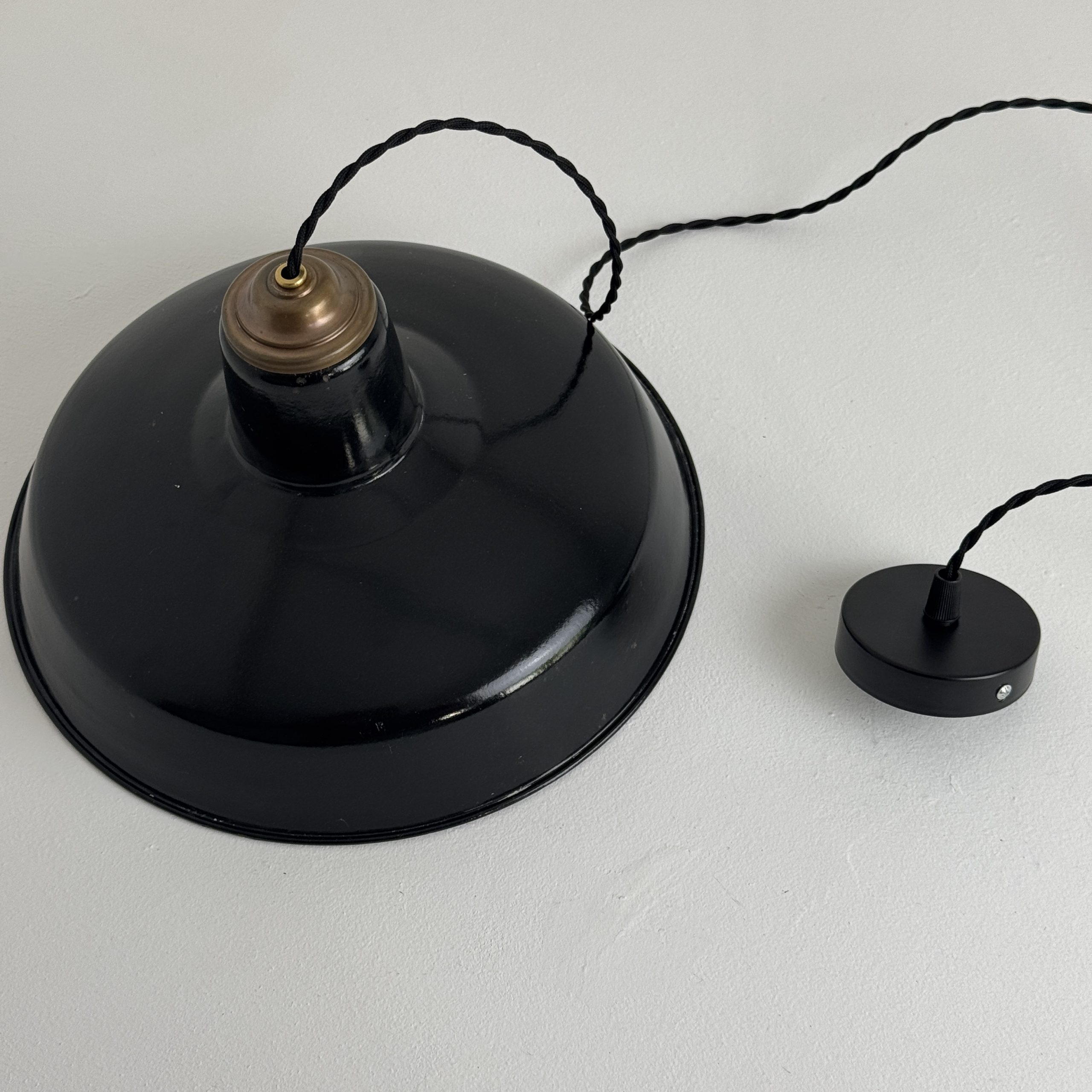 Ancienne suspension industrielle en tôle émaillée noire. Année 1950. En bel état. A noter des sauts d’emails et traces de rouille.