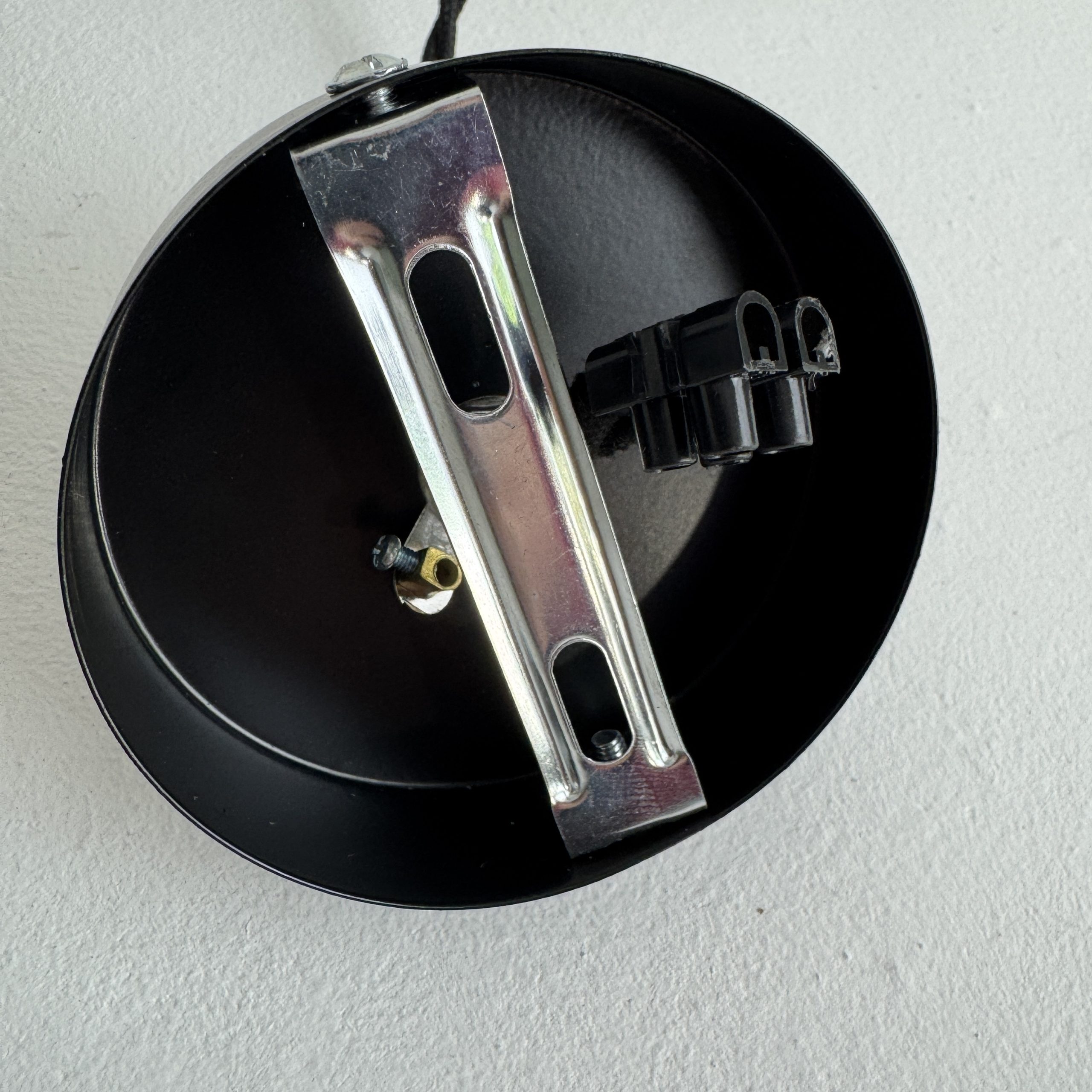 Branchement par domino. Fil noir en tissu tressé et rosace de fixation en métal noir.