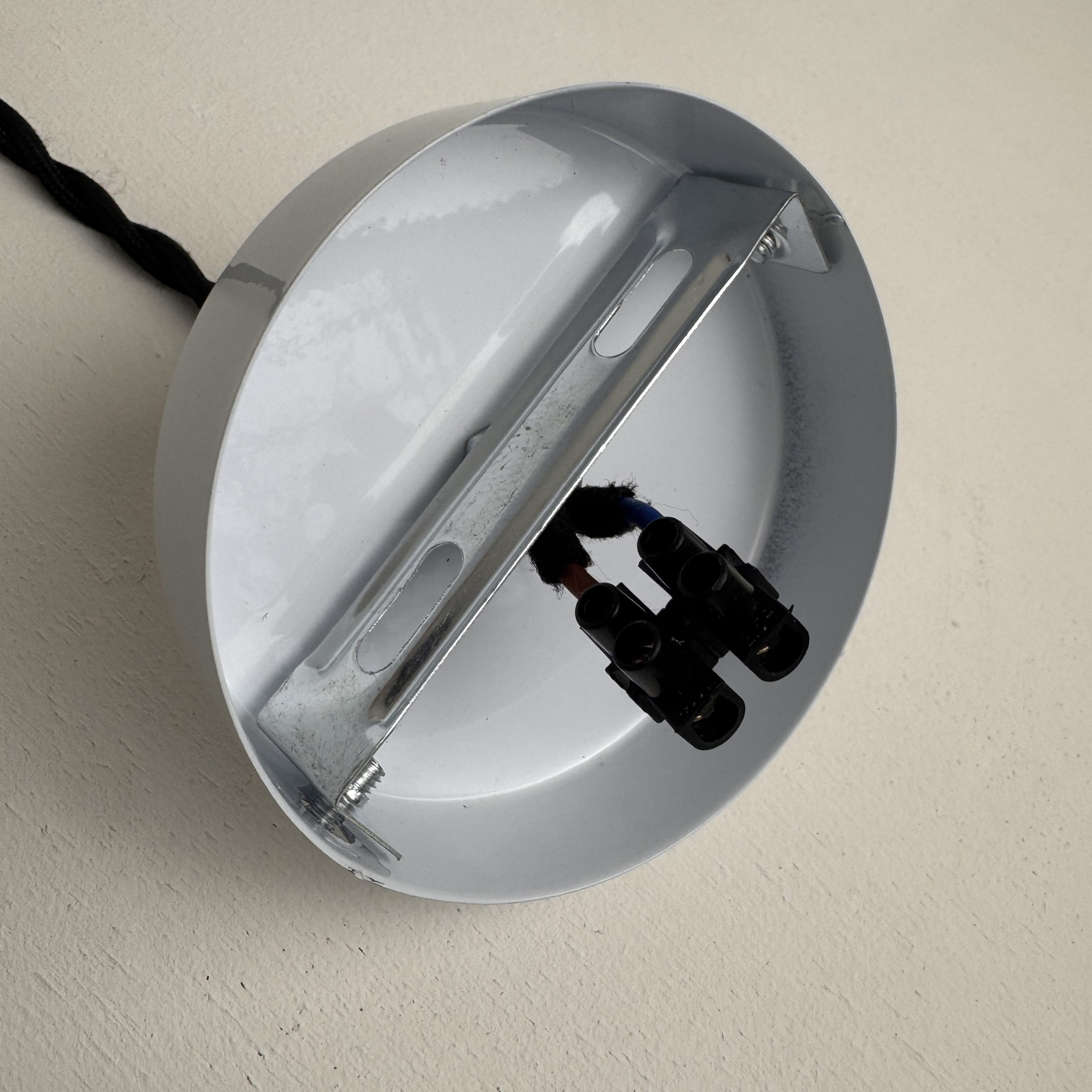 Branchement par domino. Fil noir en tissu tressé et rosace de fixation en métal.