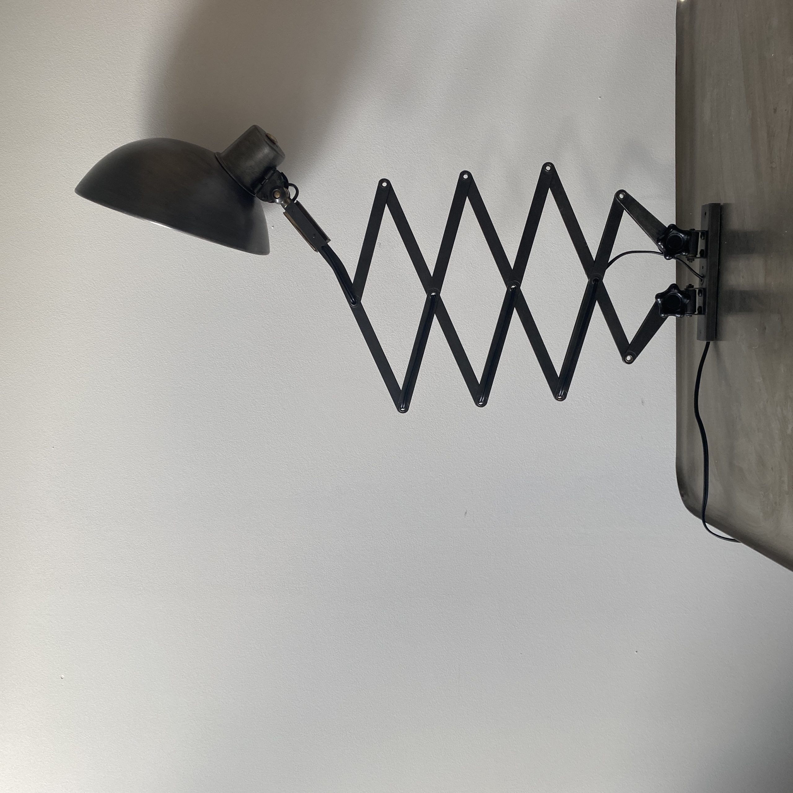 Entièrement restaurée. Poncée et patinée ton anthracite. Douille à baïonnette (B22) en laiton et fil électrique vintage noir. Electricité refaite. Bouton poussoir près du réflecteur.
