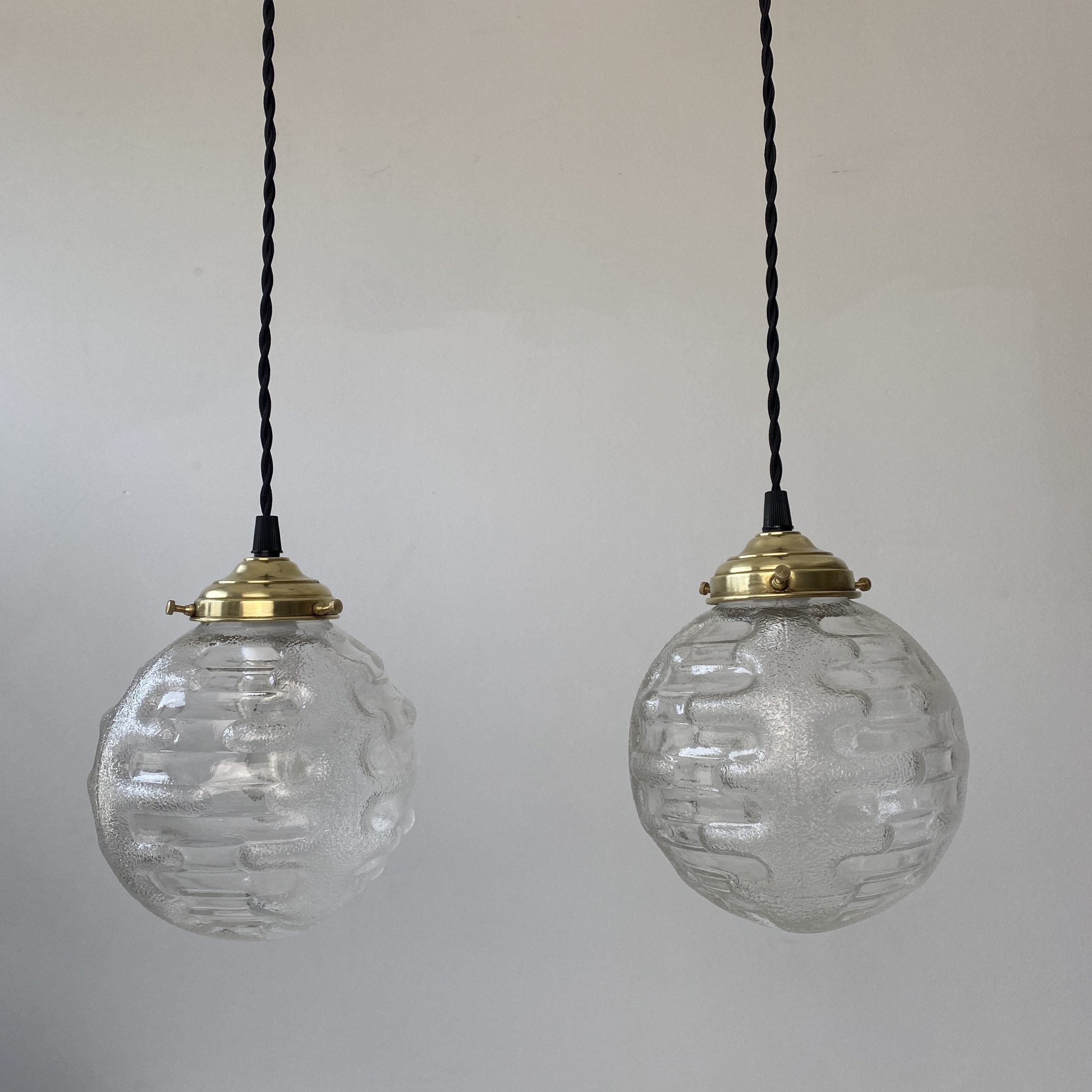 2 suspensions en verre épais d’un beau diamètre de 15 cm. En très bel état.