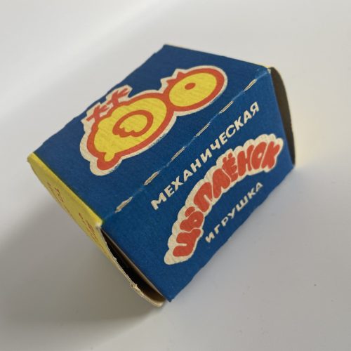 Boîte d’origine, contenant sur ses parois le mode d’emploi et les précautions à prendre (ne pas remonter jusqu’au bout). Le poussin présente quelques traces jaunes liées au temps.